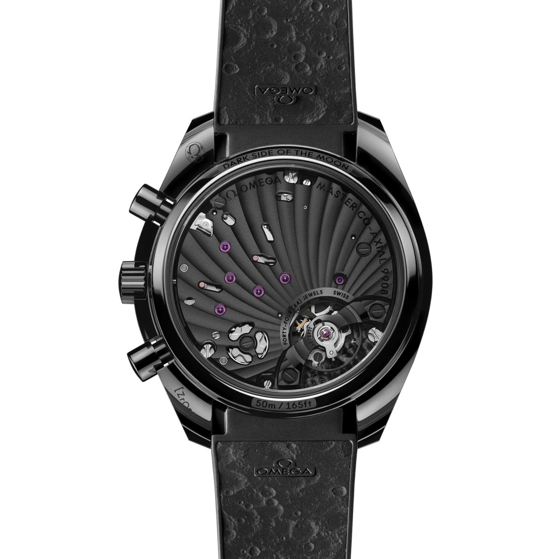 Das durch den Gehäuseboden sichtbare OMEGA Co-Axial Master Chronometer Kaliber 9908 mit Handaufzug ist mit einer speziellen „Black Edition“-Veredelung versehen, die eine mattgeschwärzte Hauptplatine und Brücken sowie schwarz lackierte Gravuren umfasst. Die Uhr wird an einem schwarzen Kautschukarmband mit einem Mondoberflächenmuster auf der Unterseite, einer Faltschließe aus Keramik und keramisiertem Titan getragen.