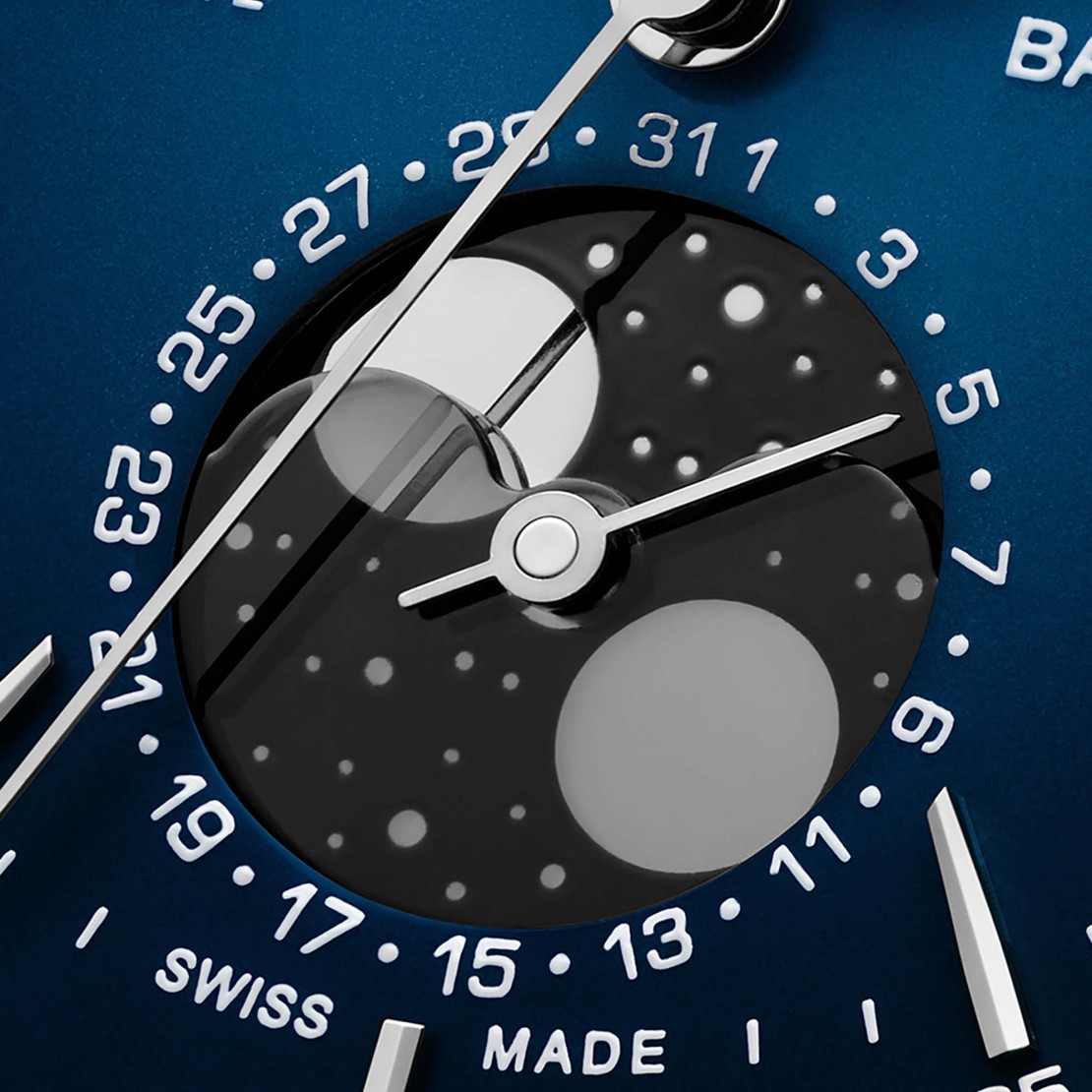 Ref. M0A10593 - Die Mondzyklen vereinigen sich mit dem ursprünglichen Baumatic Uhrwerk. Auch wenn es dieses Modell bereits in mehreren Varianten gibt, schmückt es sich hier erstmalig mit einem blau lackierten abgestuften Zifferblatt, auf dem sich bei 6 Uhr ein Sternenhimmel öffnet, der durch ein durchsichtiges graues Saphirglas sehen ist. Eine rhodinierte, polierte und schwarz lackierte Mondscheibe rundet die Komplikation ab. Eine Wochentaganzeige bei 12 Uhr erzeugt im Verbund mit der Datumsanzeige bei 6 Uhr eine perfekte Symmetrie. Das Zifferblatt ist ferner mit vernieteten, rhodinierten und leicht länglichen trapezförmigen Indizes versehen. Ebenfalls rhodiniert sind auch die facettierten Alpha-Zeiger mit spitz zulaufendem Ende.Das Wichtigste