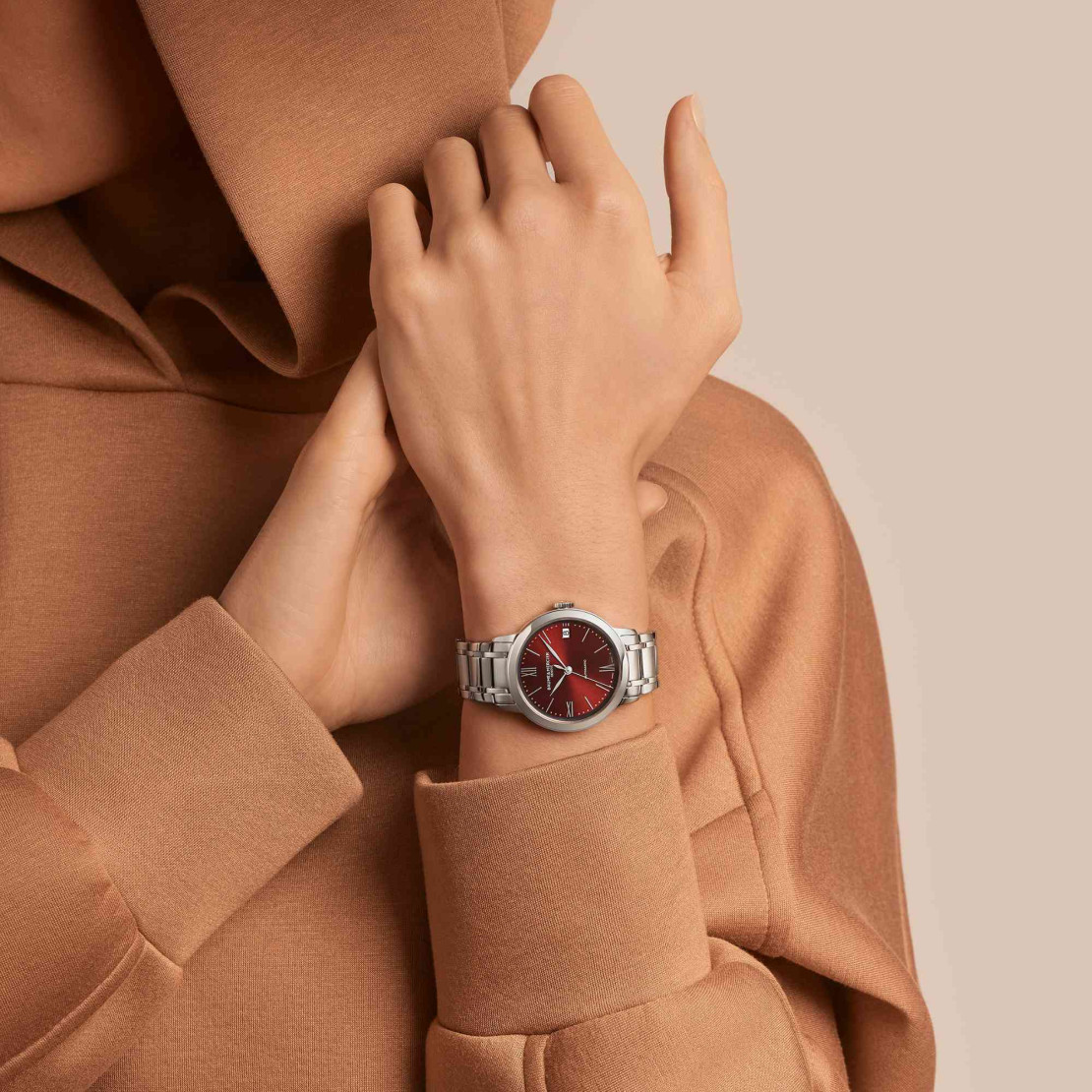Ref. M0A10691 - Zum Verlieben ist das 34-mm-Damenmodell aus poliertem Edelstahl an einem fünfreihigen Metall-Gliederarmband, das sich elegant an das Handgelenk schmiegt. Mit dem Schnellwechselsystem lässt sich das Armband ganz einfach gegen die blaue Textilvariante austauschen und der Look der Uhr entsprechend variieren. Das besonders kleine Gehäuse, perfekt rund und wunderbar flach, umrahmt ein sonnengeschliffenes Zifferblatt in Bordeaux und Blau mit faszinierenden Reflexen. Dann zieht die perlierte Eisenbahnminuterie, die sich um das runde Zifferblatt windet, die Blicke auf sich. Dort treten die für diese Kollektion charakteristischen rhodinierten römischen Ziffern und Indizes in Erscheinung. Die Blattzeiger bewegen sich scheinbar schwerelos. Ein Datumsfenster zeigt sich bei 3 Uhr. Auf der Rückseite gestattet ein Saphirglas tiefe Einblicke in das schlagende Herz der Uhr. Ihr Automatikwerk bietet eine Gangreserve von 42 Stunden.Das Wichtigste