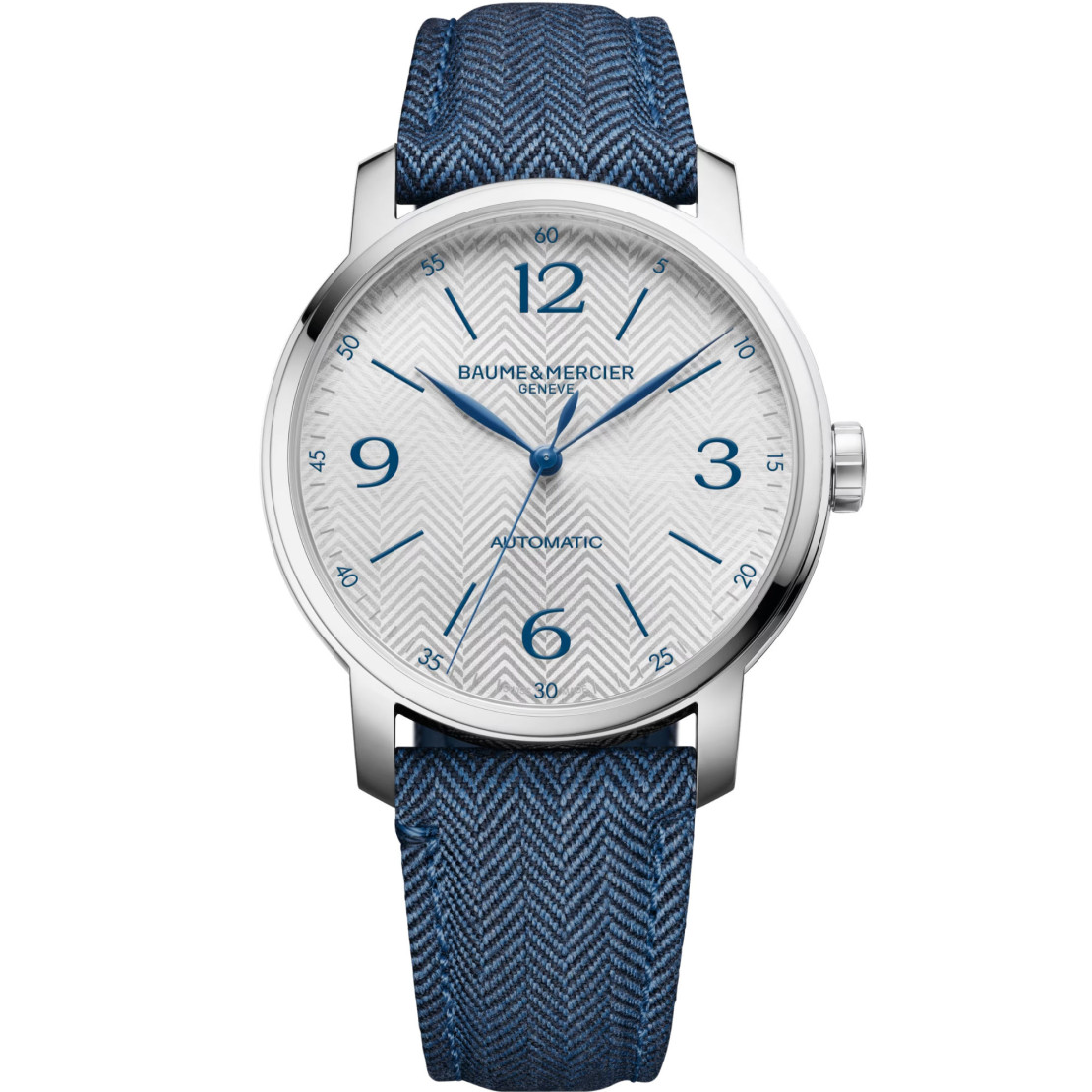 Ref. M0A10707 - Das Modell M0A10707 wird von einem Automatikwerk mit einer Gangreserve von 42 Stunden angetrieben und zeigt die Stunden, Minuten und Sekunden an. Das silberne Zifferblatt mit Sonnenschliff und Fischgrätenmuster, das in einem Gehäuse mit 42 mm Durchmesser untergebracht ist, akzentuiert die blauen arabischen Ziffern, Indizes und Blattzeiger. Ihre Armbänder sind aus blauem Stoff mit Fischgrätenmuster (Wolle) mit Sattlerstich und schwarzem Alligatorleder gefertigt. Alle Classima Bespoke Edition Uhren haben ein rundes, gewölbtes Gehäuse aus poliertem Edelstahl mit kratzfestem Saphirglas und einem massiven Boden, der graviert und personalisiert werden kann. Sie sind allesamt mit einem austauschbaren Stoffarmband ausgestattet, das mit einem sehr zuverlässigen System aus geraden Stegen und Zapfen versehen ist, mit dem das weiche Armband ohne Werkzeug ausgetauscht werden kann. Das zusätzliche Armband aus Leder, das sie begleitet, ermöglicht es, mit Materialien, Mustern und Farben zu experimentieren. Alle Armbänder werden mit einer Dornschließe geschlossen.