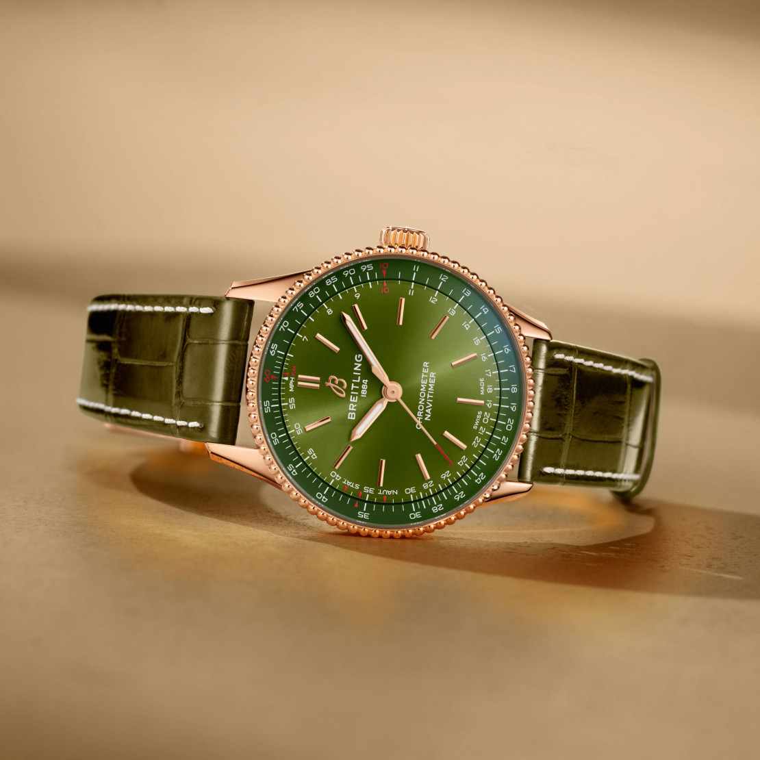 Ref. R17327371L1P1 - Breitlings Ikone – für die Reise. Die Navitimer ist eine der bekanntesten Uhren, die je hergestellt wurden. Sie steht als eine der grossartigsten Uhren aller Zeiten auf den Sammlerlisten. Was 1952 als Instrument für Piloten begann, hat inzwischen eine tiefe Bedeutung für jeden, den dieser Zeitmesser auf seiner persönlichen Reise begleitet. Unsere Ikone kommt jetzt in den Grössen 36 und 32 mm für Frauen und Männer, die die Optik und Haptik einer Uhr mit kleinerem Durchmesser lieben. Während die 36-mm-Navitimer die Perlenlünette und den ikonischen kreisförmigen Rechenschieber aufweist, die der Navitimer ihr unverkennbares Aussehen verleihen, verzichtet die beeindruckende 32-mm-Variante auf den Rechenschieber zugunsten eines schlichteren Zifferblattdesigns, das auf den schlanken Durchmesser abgestimmt ist.