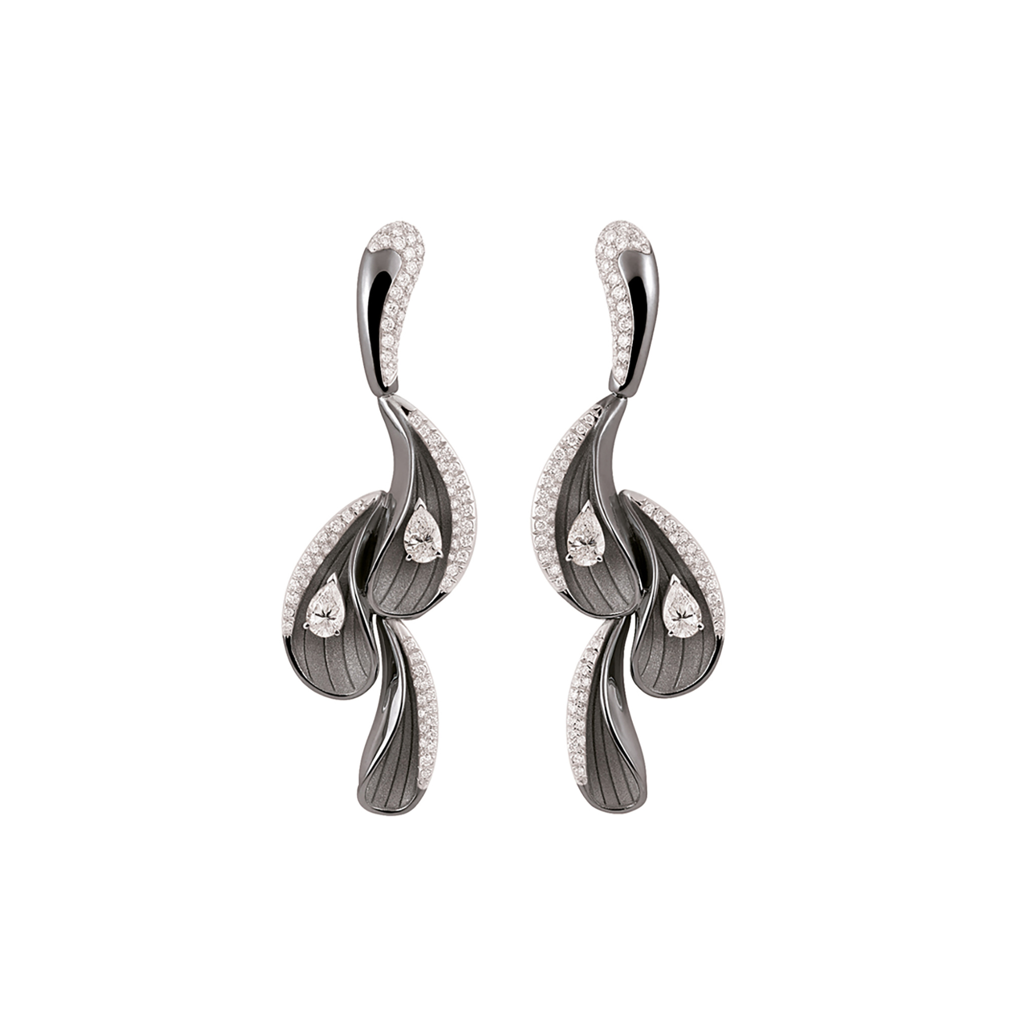 Ref. GOR3487ET40 - Moon Drops entsteht aus der perfekten Umarmung zwischen weichen Goldtropfen, die von einem Rand aus Diamantpavé beleuchtet werden, der an die umhüllende Form des Mondes erinnert. In der Mitte jedes Elements macht ein Stein im Tropfenschliff, der in der Version mit weißem, Fancy Color Diamant oder blauen Saphiren erhältlich ist, jede Kreation noch prächtiger.