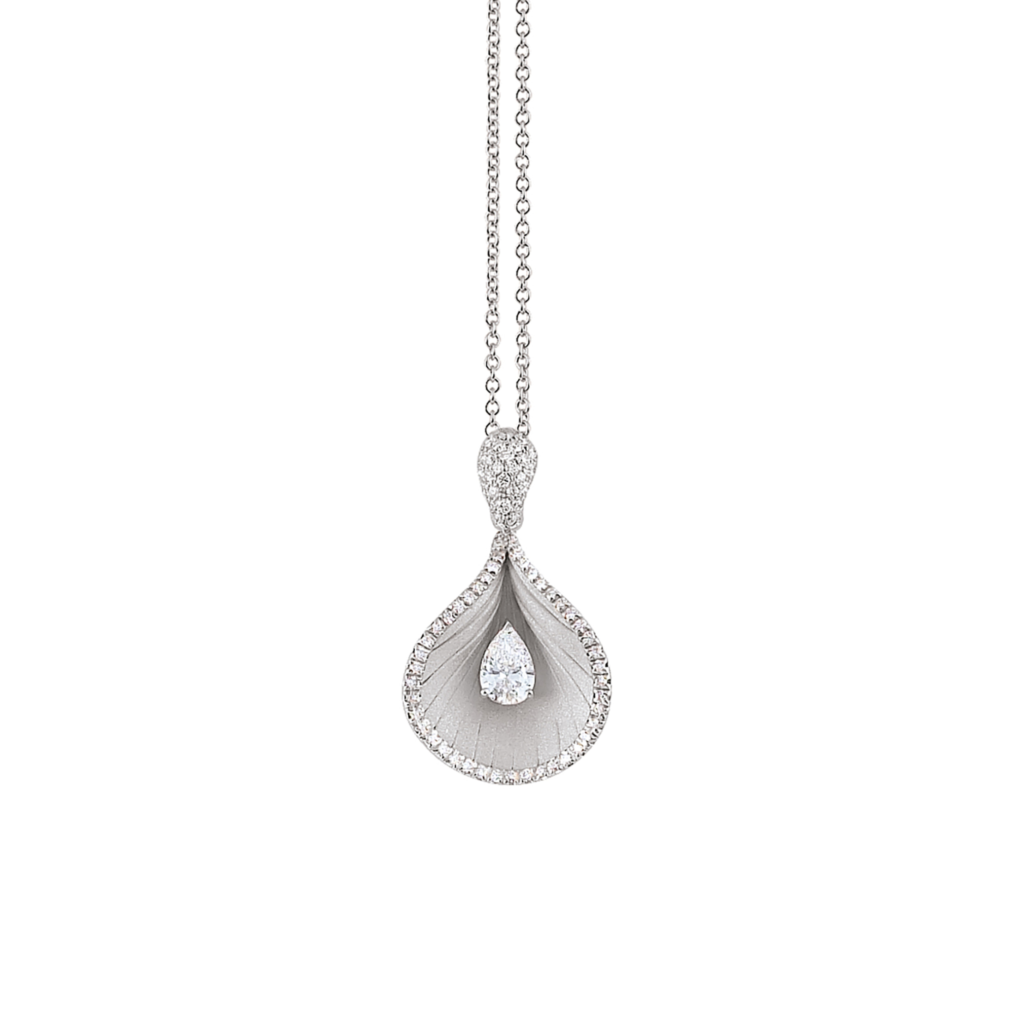 Ref. GPE1969W - Ein weiches und einhüllendes Design schließt wertvollen Diamanten im Tropfenschliff ein, die von einem glänzenden Diamantenrahmen begrenzt werden.