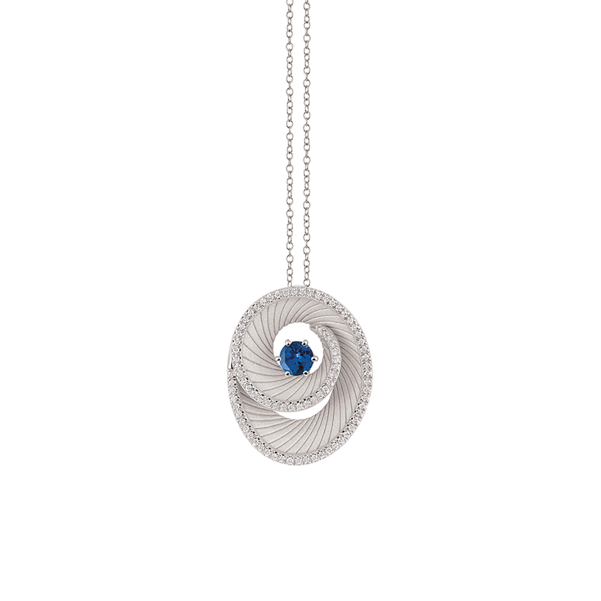 Ref. GPE3614WT45 - Eine majestätische Spirale aus Gold umhüllt einen leuchtenden Diamanten in einem hypnotischen Spiel aus skulpturalen Formen und Geometrien, hervorgehoben durch einen Diamantrand: So entsteht die Athena-Serie, ein Symbol für die Kraft der Weiblichkeit.