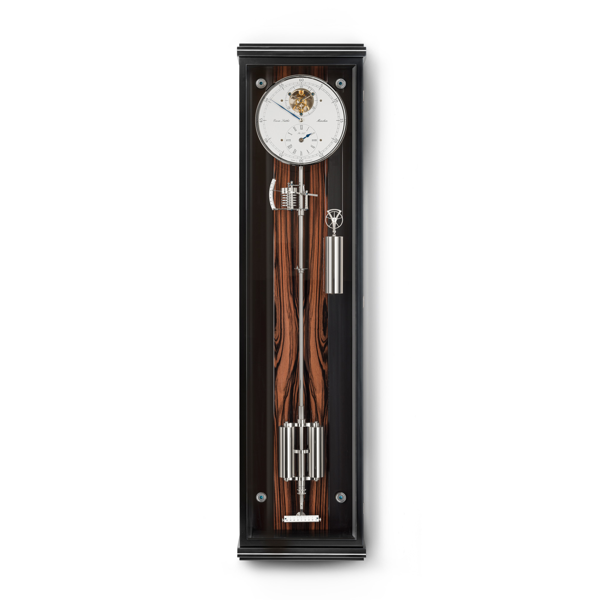 Das Erscheinungsbild der Classica Secunda 1995 M ist geprägt von einem durchbrochenen Zifferblatt im Sekundenkreis, das einen Blick auf die vergoldeten Zahnräder gewährt. Weitere liebevolle Details sind die sternförmige Gangradbrücke aus Edelstahl und die in aufwändiger Handarbeit bombierten, polierten und blau angelassenen Poire-Zeiger. Ein Glas im Dach erlaubt einen Lichteinfall und damit die Beleuchtung des Uhr-Inneren von oben. Edle Hölzer schließen das präzise Uhrwerk ein und vervollständigen es zu einem zeitlosen Kunstwerk.