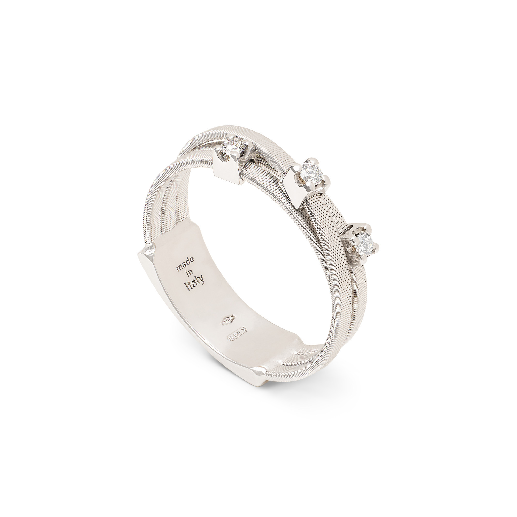 Ref. AG269 B W - Dieser elegante Ring aus Weißgold mit 18 Karat besteht aus ineinander verflochtenen Flachspiralbändern, die mit der exklusiven handwerklichen Coil-Technik gefertigt und mit drei gefassten Diamanten in Brillantschliff geschmückt sind. Der Ring besticht durch die Originalität seines linearen und essenziellen Designs.