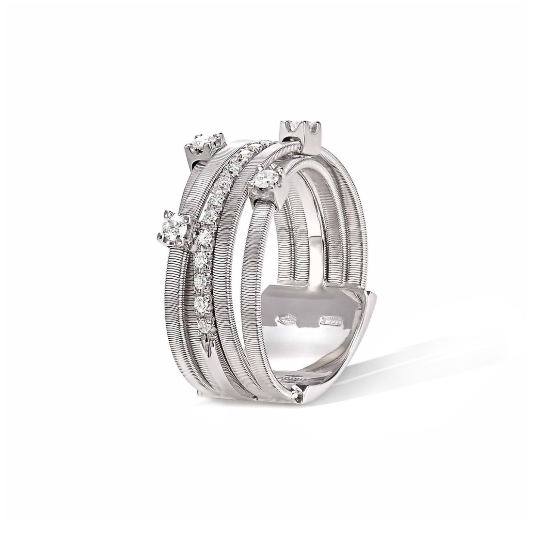 Ref. AG270 B2 W - Dieser elegante Ring aus 18-karätigem Weißgold besteht aus fünf Reihen ineinander verflochtener Flachspiralen. Er ist mit einer Reihe von Diamanten im Brillantschliff geschmückt und bildet ein zeitlos elegantes Prêt-à-porter-Schmuckstück.Das Wichtigste