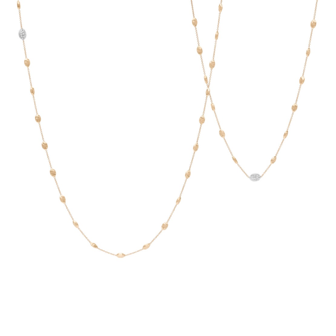 Ref. CB1843 B YW - Diese lange Halskette besteht aus einer Abfolge kleiner Ovale aus Gelbgold mit 18 Karat, deren unregelmäßig satinierte Oberfläche in einer antiken Technik mit dem Fadenstichel fein von Hand graviert ist. Dazwischen setzen Elemente mit Diamantpavé in Brillantschliff kostbare Glanzakzente. Die Kette, die auch doppelt um den Hals getragen werden kann, besitzt eine Anmutung von Leichtigkeit, Energie und Lebensfreude.Das Wichtigste