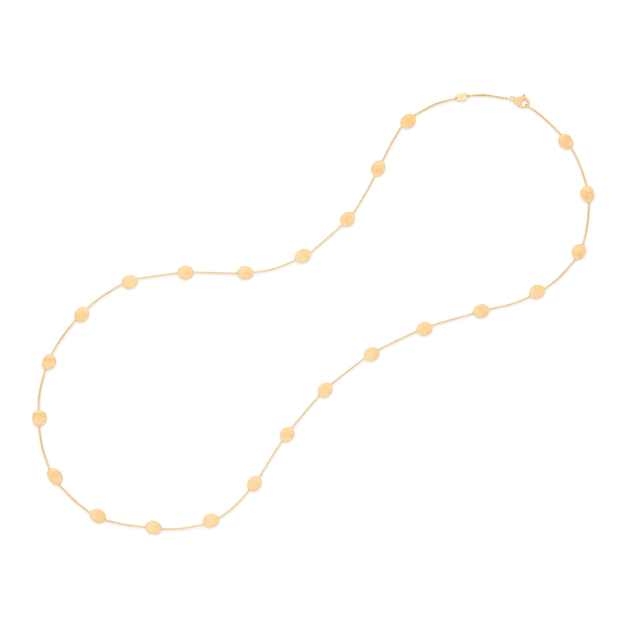 Ref. CB2948 Y - Diese lange Halskette in zeitlosem Design besteht aus kleinen ovalen Elementen in Gelbgold mit 18 Karat, deren unregelmäßige Oberfläche in einer antiken Technik mit dem Fadenstichel von Hand graviert ist, um eine zarte, unregelmäßige Satinierung zu erzielen. Ein zeitloser Klassiker, der zu jedem Anlass passt.Das Wichtigste