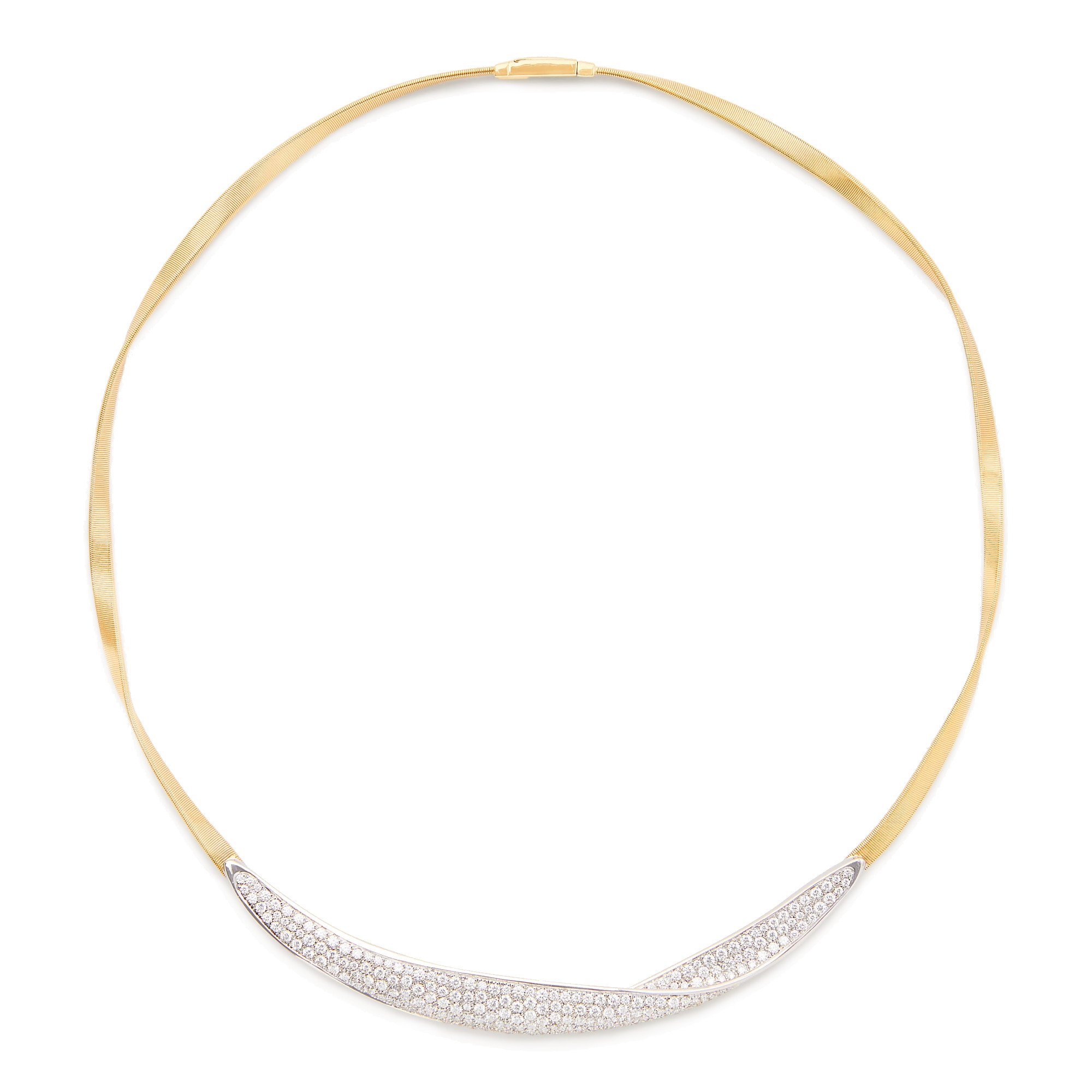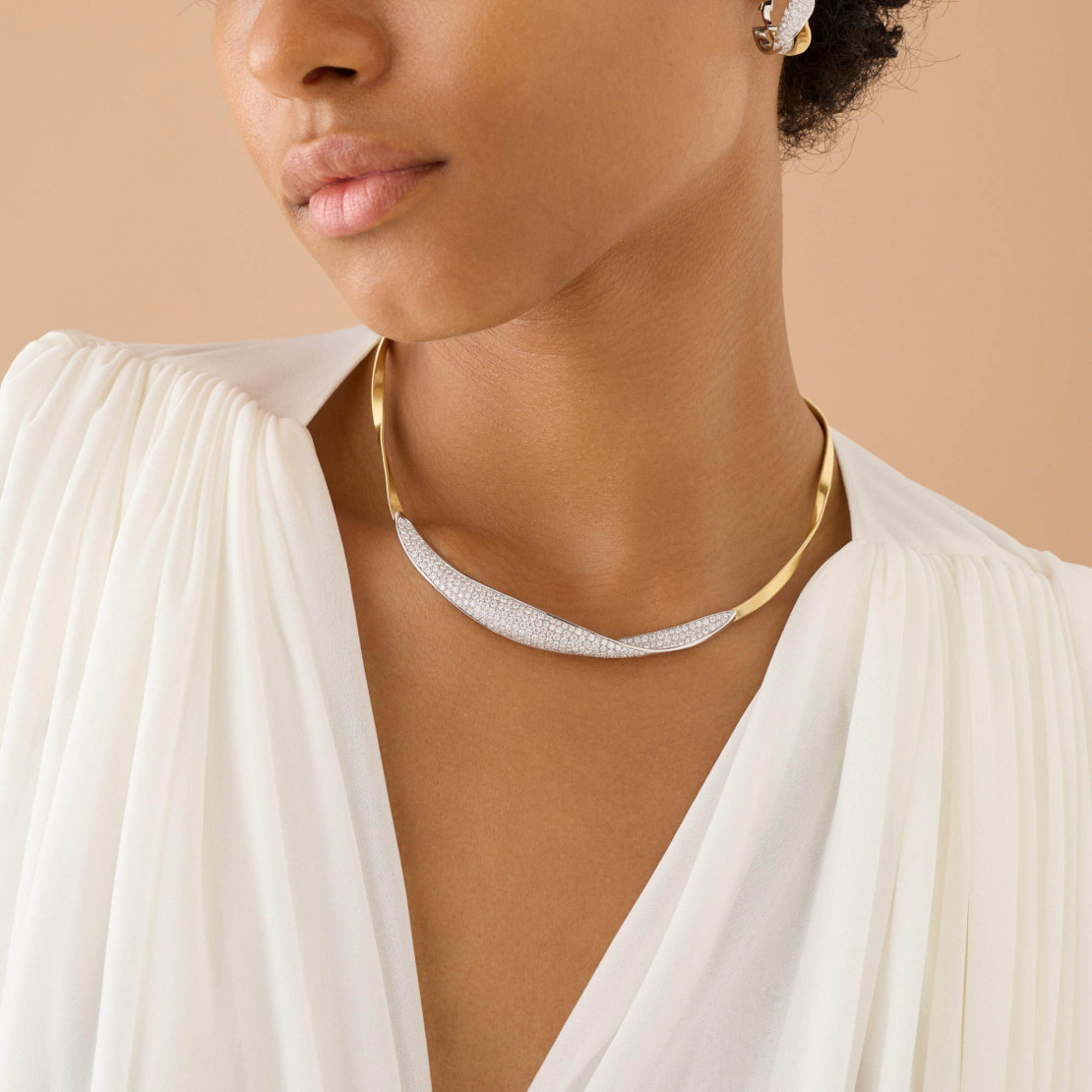 Ref. CG750 B1 YW - Dieses Meisterwerk aus Licht und Volumen ist der ultimative Ausdruck der Kombination der Coil-Technik und dem strahlenden Glanz von Diamanten. Das einzelne gedrehte Band aus 18 Karat Gelbgold umfasst in seiner Mitte ein Element mit Diamantpavé in Brillantschliff, das sanft der Drehung des Goldbands folgt und das Licht mit tausenden Reflexen einfängt. Diese Halskette bildet die perfekte Balance von traditioneller Handwerkskunst und modernem Design. Sie feiert das Wesen der High Jewelry und ihre zeitlose Eleganz.