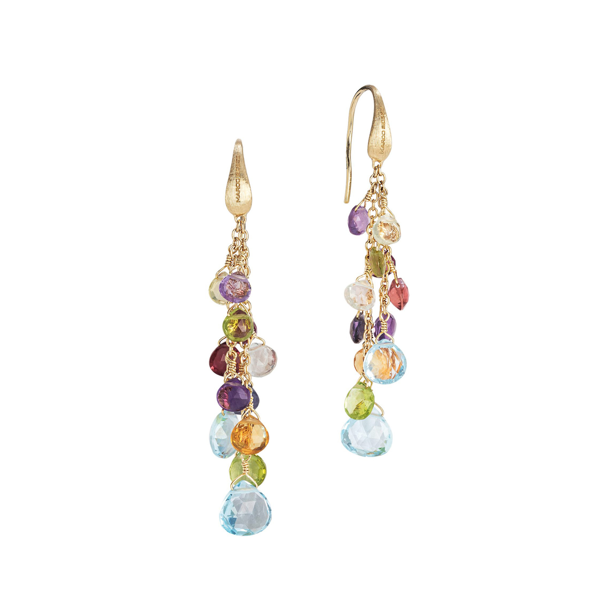 Ref. OB1753-A MIX01T Y - Dieser wunderschöne Ohrring zeichnet sich durch die leuchtenden Farbtöne der bunten Edelsteine im Herzschliff aus. Der Haken aus 18-karätigem Gelbgold ist von Hand mit der traditionellen Fadensticheltechnik graviert.