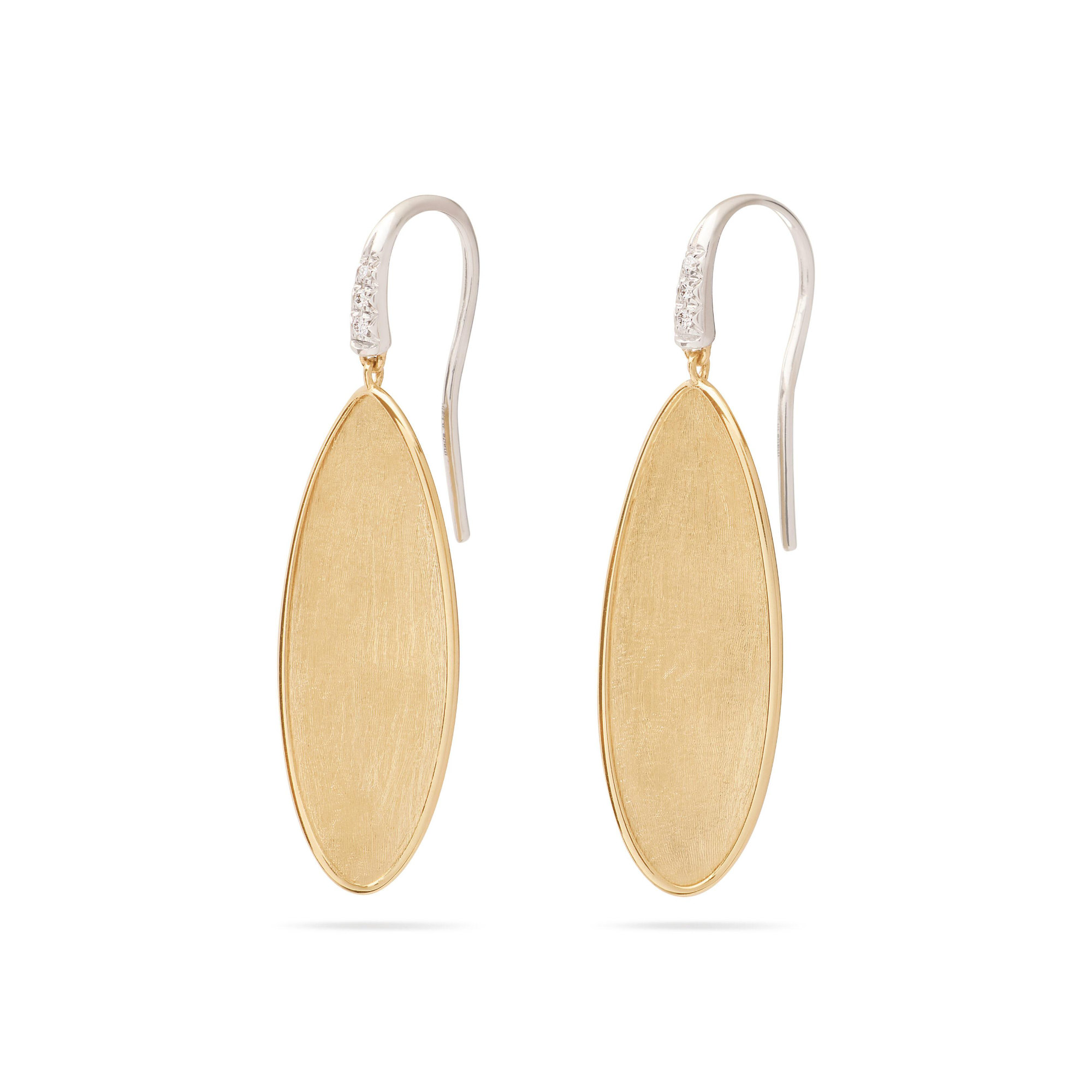 Ref. OB1913-A B YW - Das ikonische Blattmotiv, neu interpretiert mit einem erlesenen Touch. Diese unregelmäßig geformten Hängeohrringe sind mit einer alten Florentiner Technik fein von Hand graviert. Die Blätter aus 18 Karat Gelbgold, fügen sich durch ihre sanft gedrehte Form zu einer fließenden, skulpturalen Silhouette zusammen, der Haken ist mit einem feinen Diamantpavé geschmückt.Das Wichtigste
