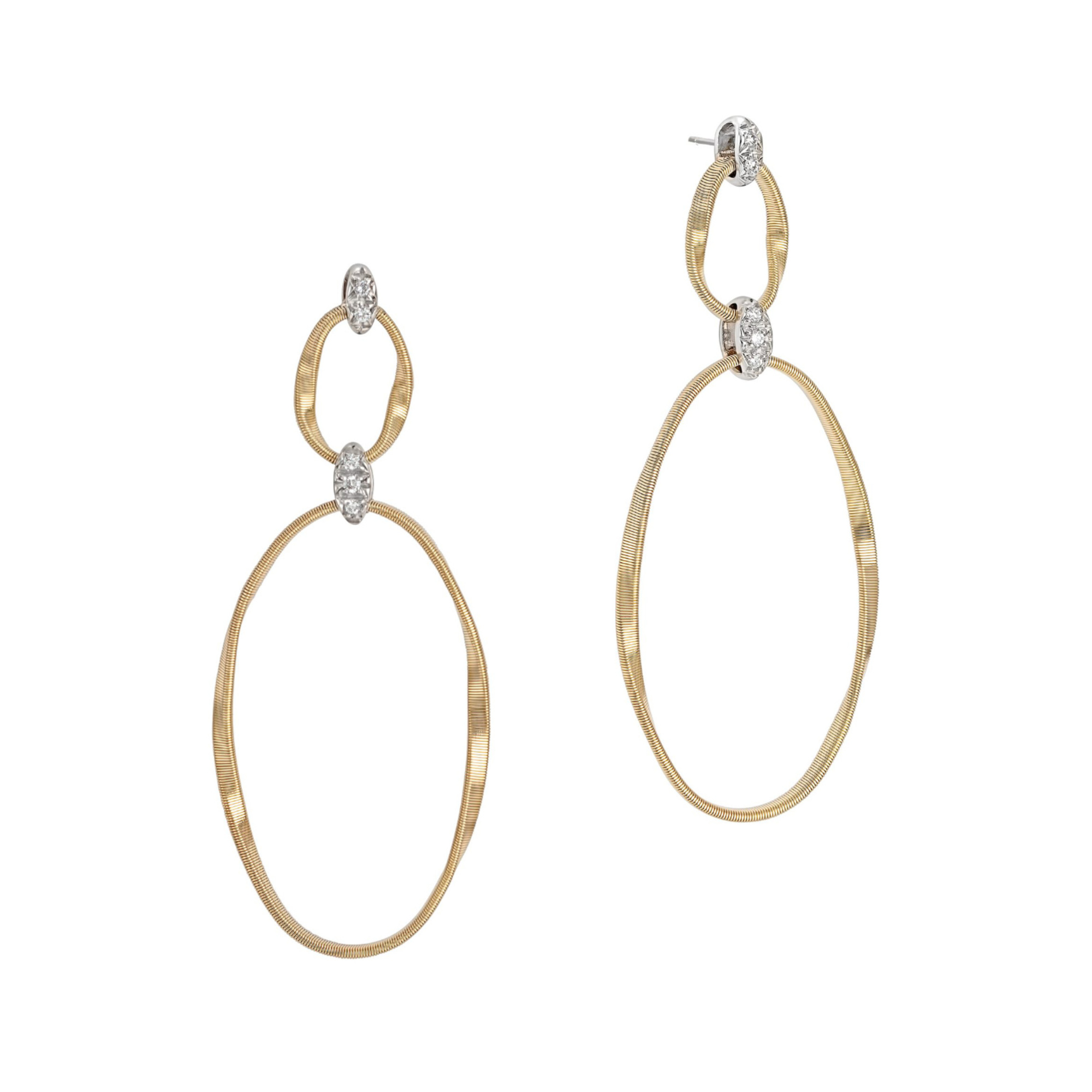Ref. OG369 B2 YW - Zwei Ovale aus gedrehter Spirale, die mit der exklusiven handwerklichen Coil-Technik gefertigt sind, verbinden sich zu einem Schmuckstück von schlichter Eleganz. Der Ohrring aus Gelbgold mit 18 Karat ist mit einem Haken mit Diamantpavé in Brillantschliff geschmückt.Das Wichtigste