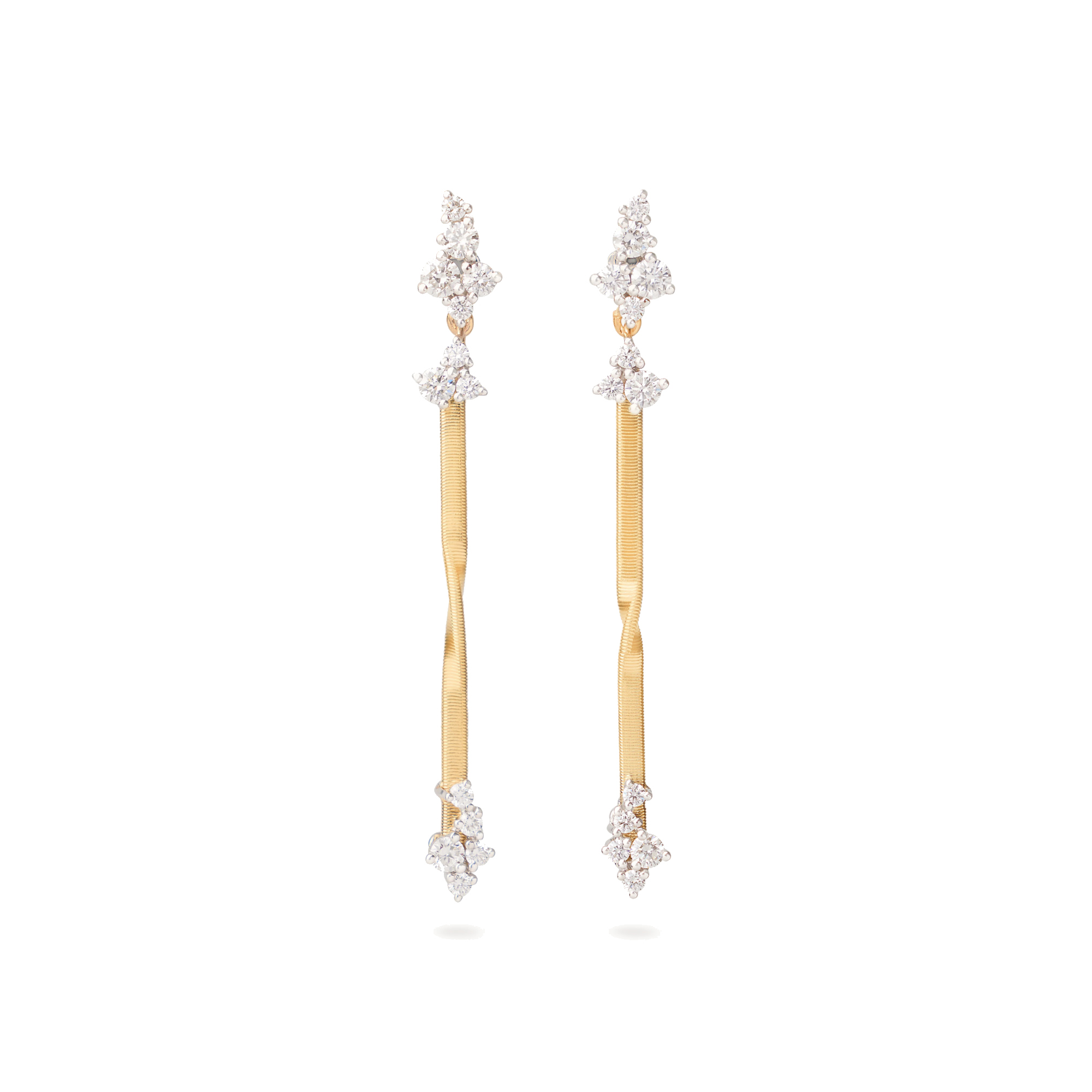Ref. OG420 B YW - Diese eleganten und skulpturalen Hängeohrringe aus 18 Karat Gelbgold zeigen ein gedrehtes Band, das mit der exklusiven Coil-Technik gefertigt wurde. An den Enden schaffen zwei unregelmäßig gefasste Diamantpavés einen glanzvollen, dynamischen Effekt, der das Licht bei jeder Bewegung einfängt.