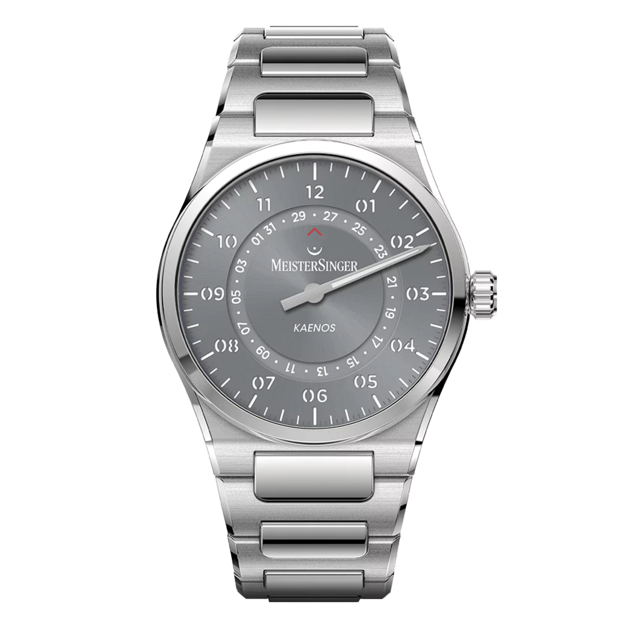 Ref. KSOD927 - Die Oberflächen des 40mm-Gehäuses sind teils poliert, teils gebürstet, was den Gehäusekörper besonders edel und lebendig wirken lässt. Das integrierte und fließend ins Gehäuse übergehende Stahlarmband, das ebenfalls durch polierte und gebürstete Flächen besticht, bietet nicht nur Stabilität, sondern auch maximalen Tragekomfort. Die ebenfalls neu gestaltete, griffige und leicht zu handhabende Krone trägt das Fermate-Symbol aus dem MeisterSinger Logo, das Ruhezeichen in der Notenschrift. Mit einer Wasserdichtigkeit bis zu 10 bar ist die Kaenos in jeder Alltagssituation gut geschützt.Das Wichtigste
