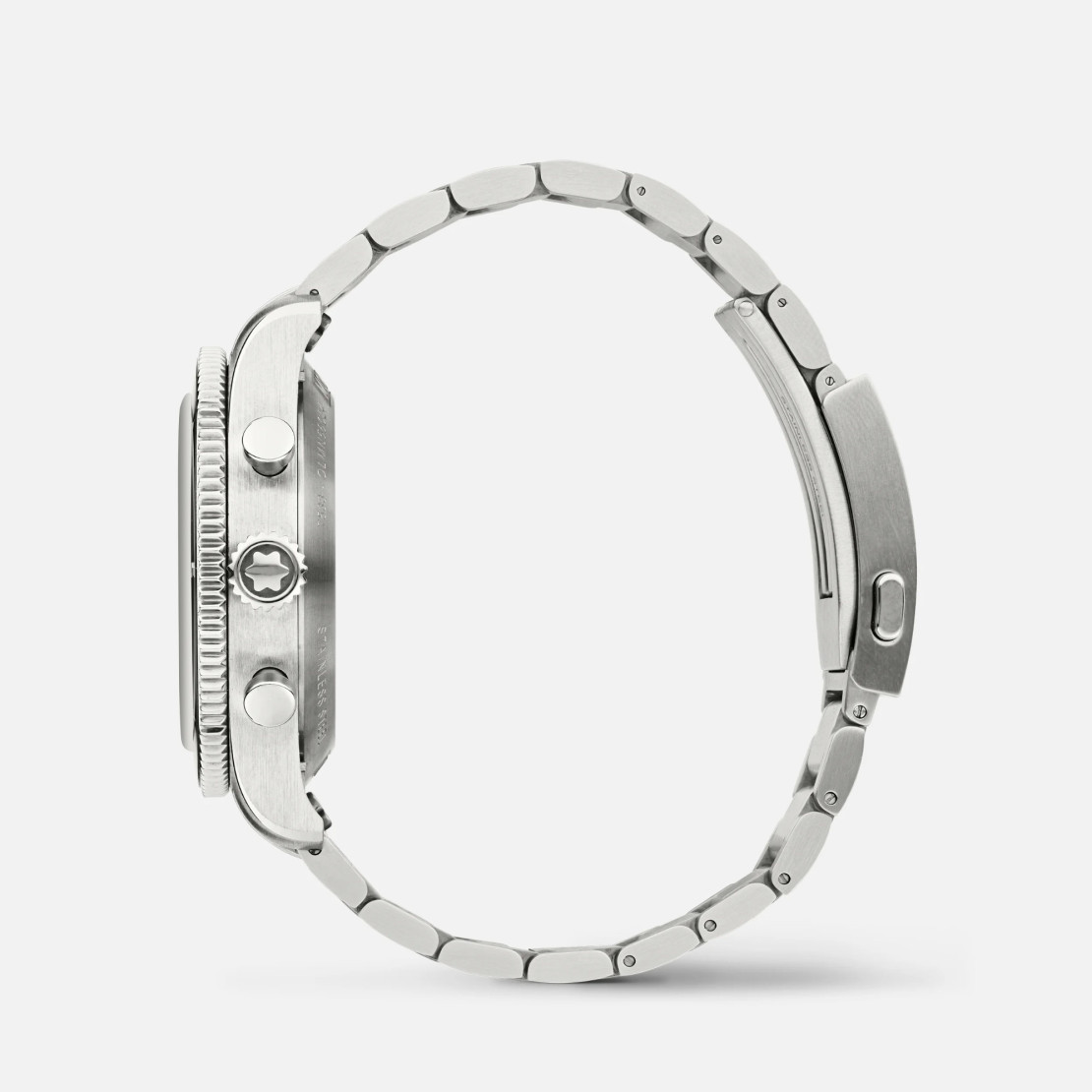 Das Vermeiden von Feuchtigkeitsbildung und Oxidation ist für die Entdecker von großem Vorteil, da das Uhrwerk so länger und präziser funktioniert. Angetrieben wird die Uhr vom MB 25.13 Automatikchronographen. Sie verfügt über eine geriffelte, beidseitig drehbare schwarze Keramiklünette mit leuchtenden Himmelsrichtungen sowie über ein dunkelgraues Sfumato-Zifferblatt mit Gletschermotiv, orangefarbenen Akzenten und blauen Leuchtelementen.