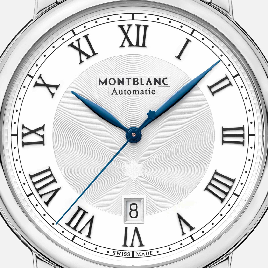 Gemäß den Designcodes der Produktlinie verfügt die Montblanc Star Legacy Automatic Date über ein feines silbrig-weißes Zifferblatt mit dem guillochierten Muster des explodierenden Montblanc Sterns, römische Ziffern, Blattzeiger, ein guillochiertes „filet sauté“-Motiv und eine Minuteneinteilung in Schienenoptik.