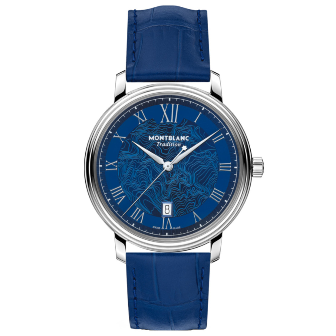 Ref. MB131274 - Die Montblanc Tradition Automatic Date verfügt über ein 40-mm-Edelstahlgehäuse, das mit geraden Hörnern und einer doppelt geformten Lünette versehen ist. Die Uhr ist mit einem blauen Zifferblatt ausgestattet, das die Topographie des Mont Blanc nachbildet und über silberfarbene römische Ziffern und eine hervorstehende römische Ziffer „XII“ verfügt. Die schwertförmigen Stunden- und Minutenzeiger, der Sekundenzeiger und die Krone mit dem Montblanc Emblem sowie das austauschbare blaue Kalbslederarmband runden das moderne elegante Erscheinungsbild ab.