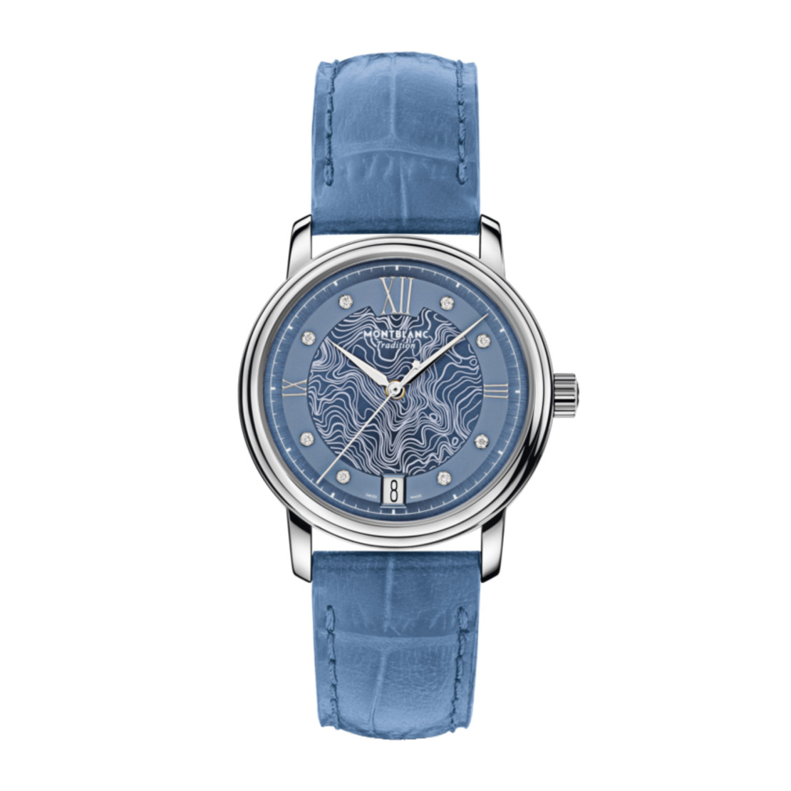 Ref. MB131296 - Die Montblanc Tradition Automatic Date verfügt über ein 32-mm-Edelstahlgehäuse, das mit geraden Hörnern und einer doppelt geformten Lünette versehen ist. Die Uhr ist mit einem blauen Zifferblatt ausgestattet, das die Topographie des Mont Blanc nachbildet und über Diamantindizes, silberfarbene römische Ziffern und eine hervorstehende römische Ziffer „XII“ verfügt. Die schwertförmigen Stunden- und Minutenzeiger, der Sekundenzeiger und die Krone mit dem Montblanc Emblem sowie das austauschbare blaue Kalbslederarmband runden das moderne elegante Erscheinungsbild ab.Das Wichtigste