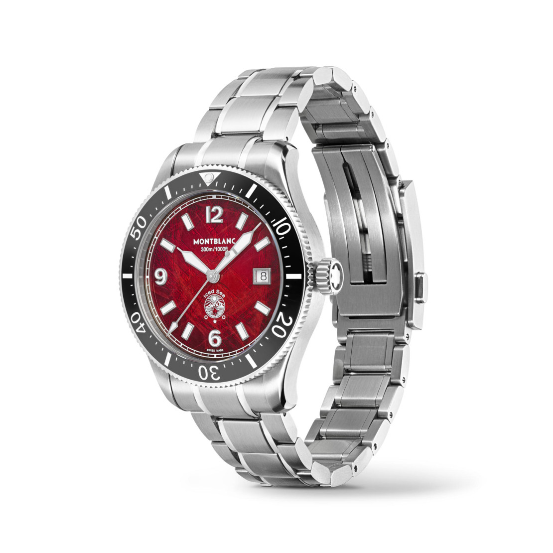 Ref. MB132291 - Die Montblanc Iced Sea Automatic Date verfügt über ein bordeauxfarbenes Zifferblatt mit Gletschermuster, das an die tiefrote Farbe der Abendsonne erinnert, die auf den Gletscher strahlt. Das Zifferblatt mit Gletschermuster ist vom Mer de Glace inspiriert, dem Hauptgletscher des Mont Blanc Massivs. Seine Textur wurde mithilfe einer nahezu in Vergessenheit geratenen Technik erhalten, dem „gratté-boisé“. Die Uhr verfügt über eine einseitig drehbare schwarze Keramiklünette, eine 3D-Gravur auf dem Gehäuseboden und ein austauschbares Edelstahlarmband mit Feineinstellung. Die Uhr erfüllt die Anforderungen der ISO 6425 Norm für Gerätetauchen und ist wasserdicht bis 300 Meter.