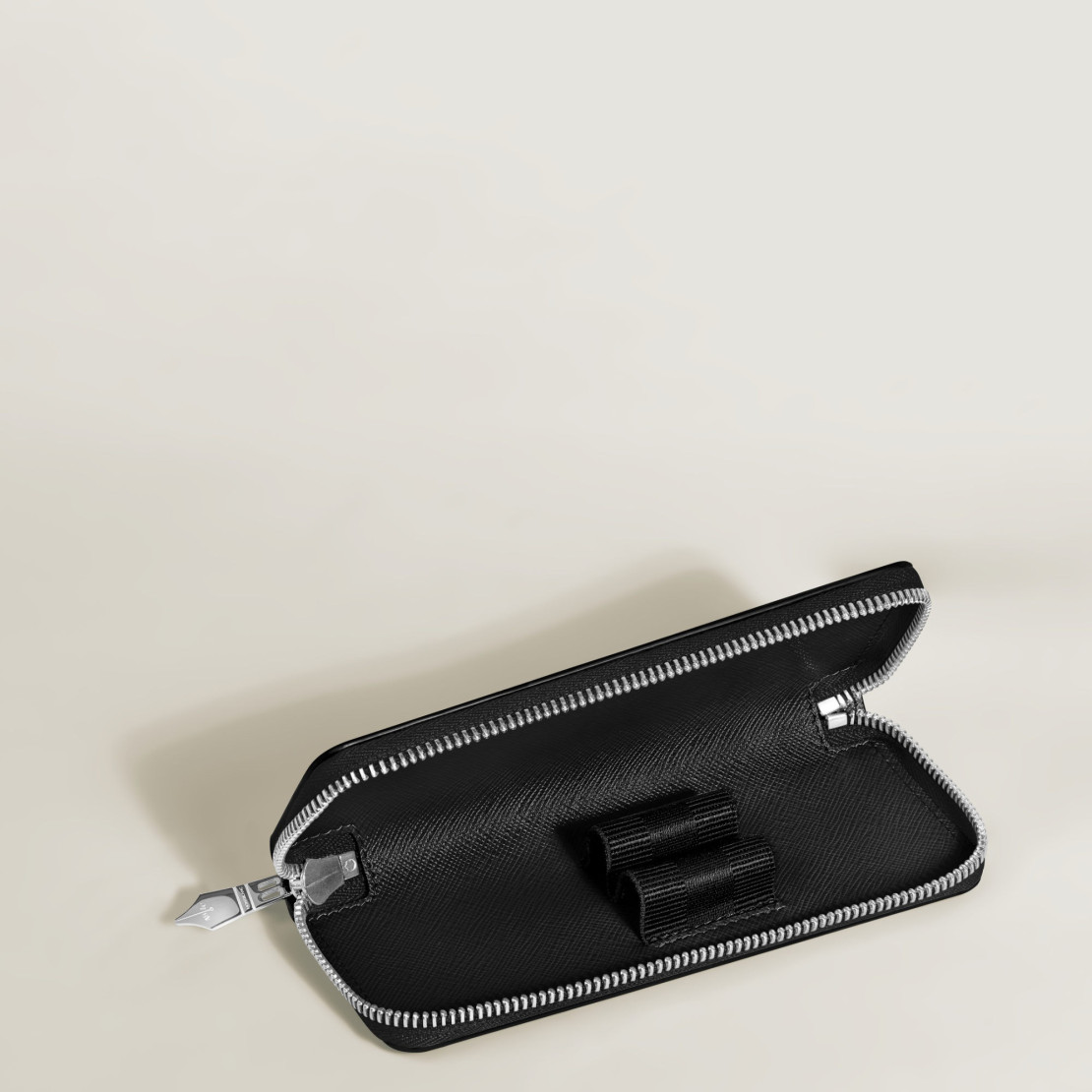 Ref. MB220370 - Entworfen für zwei Schreibgeräte in der Größe des Meisterstück Classique oder LeGrand, bietet dieses Etui eine sichere und stilvolle Möglichkeit, Ihre wertvollsten Schreibgeräte zu transportieren oder aufzubewahren. Es ist aus geprägtem, hochwertigem Leder in klassischem Schwarz gefertigt und verfügt über einen markanten Reißverschlussschieber in Form einer Feder, der an die traditionsreiche Schreibkunst von Montblanc erinnert.Das Wichtigste