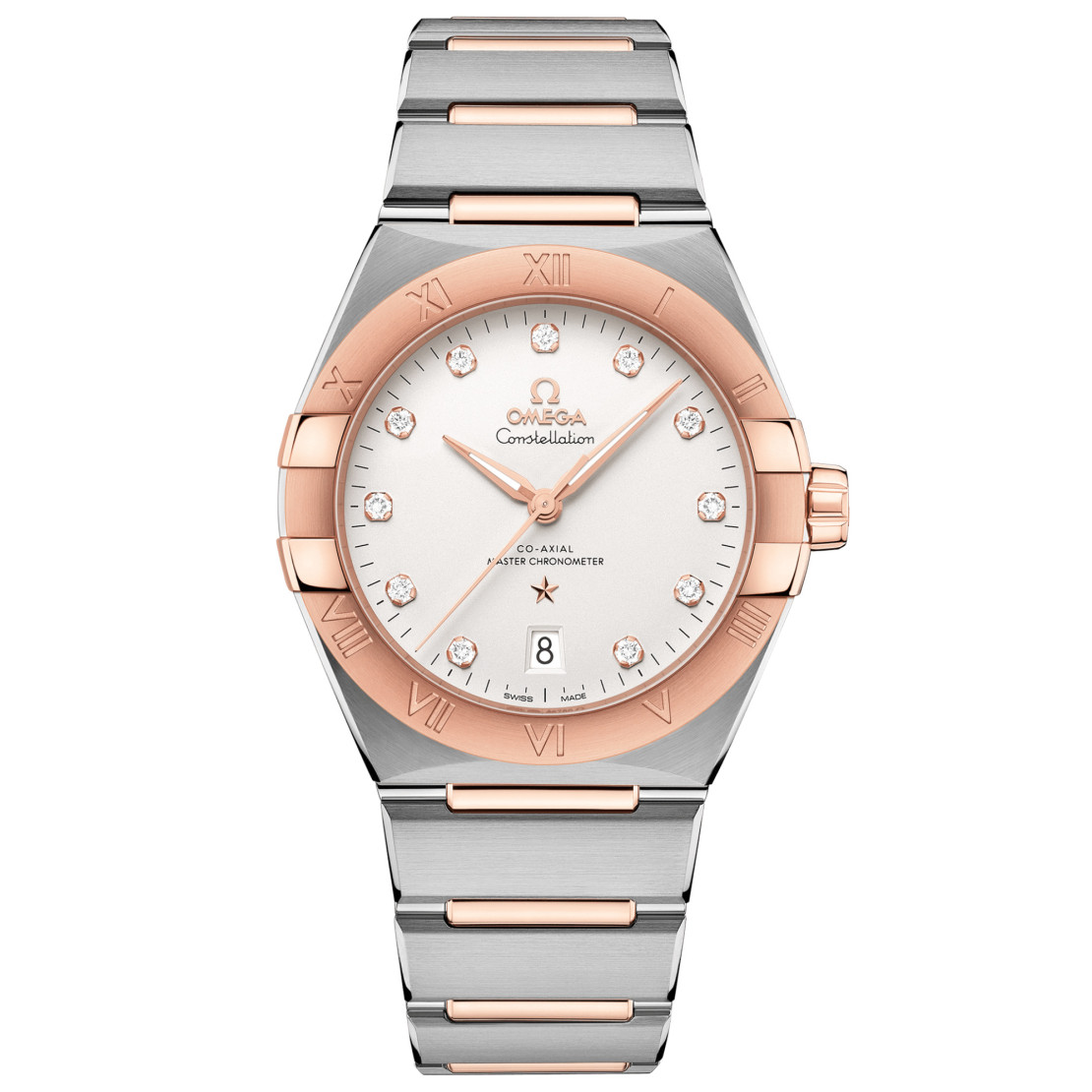 Ref. 131.20.39.20.52.001 - Das spektakuläre und langlebige Design der OMEGA Constellation zeichnet sich durch die berühmten Halbmonde, die „Krappen“ am Gehäuse und das „Mono-Rang“-Armband aus. Dieses 39 mm große Modell in Edelstahl und 18 K Sedna™-Gold verfügt über eine mit römischen Ziffern gravierte Lünette, ein opalweißes versilbertes Zifferblatt mit Diamantindizes und ein Datumsfenster bei 6 Uhr. Die Zeiger, das OMEGA Logo, der Constellation-Stern und die Diamantfassungen sind allesamt aus 18 K Sedna™-Gold. Das Herzstück dieses Zeitmessers bildet das OMEGA Co-Axial Master Chronometer-Kaliber 8800, das durch das gewölbte kratzresistente Saphirglas bewundert werden kann.Das Wichtigste