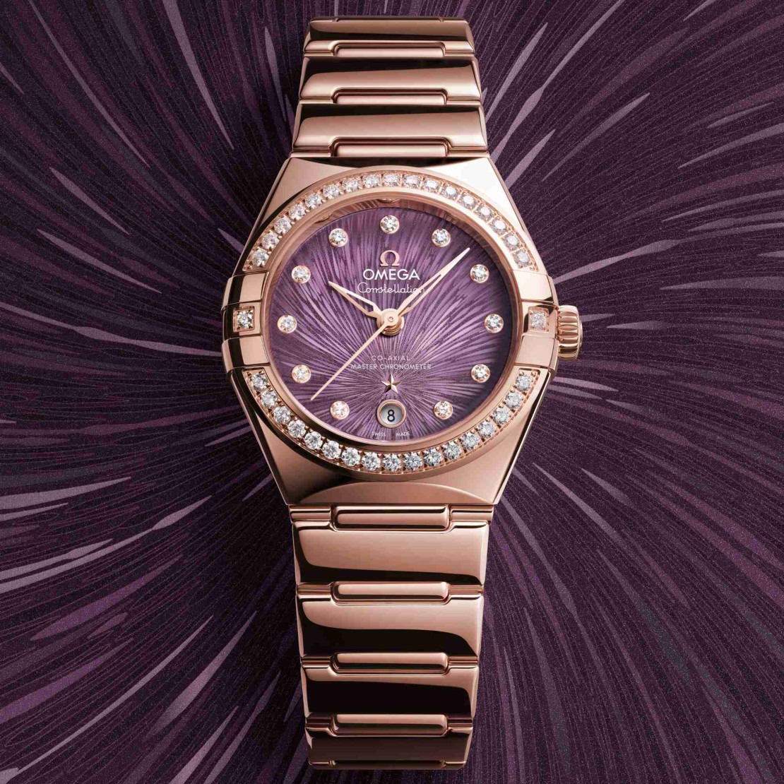 Die Zeiger, das OMEGA Logo, der Constellation-Stern und die Diamantfassungen sind ebenfalls aus 18 K Sedna™-Gold