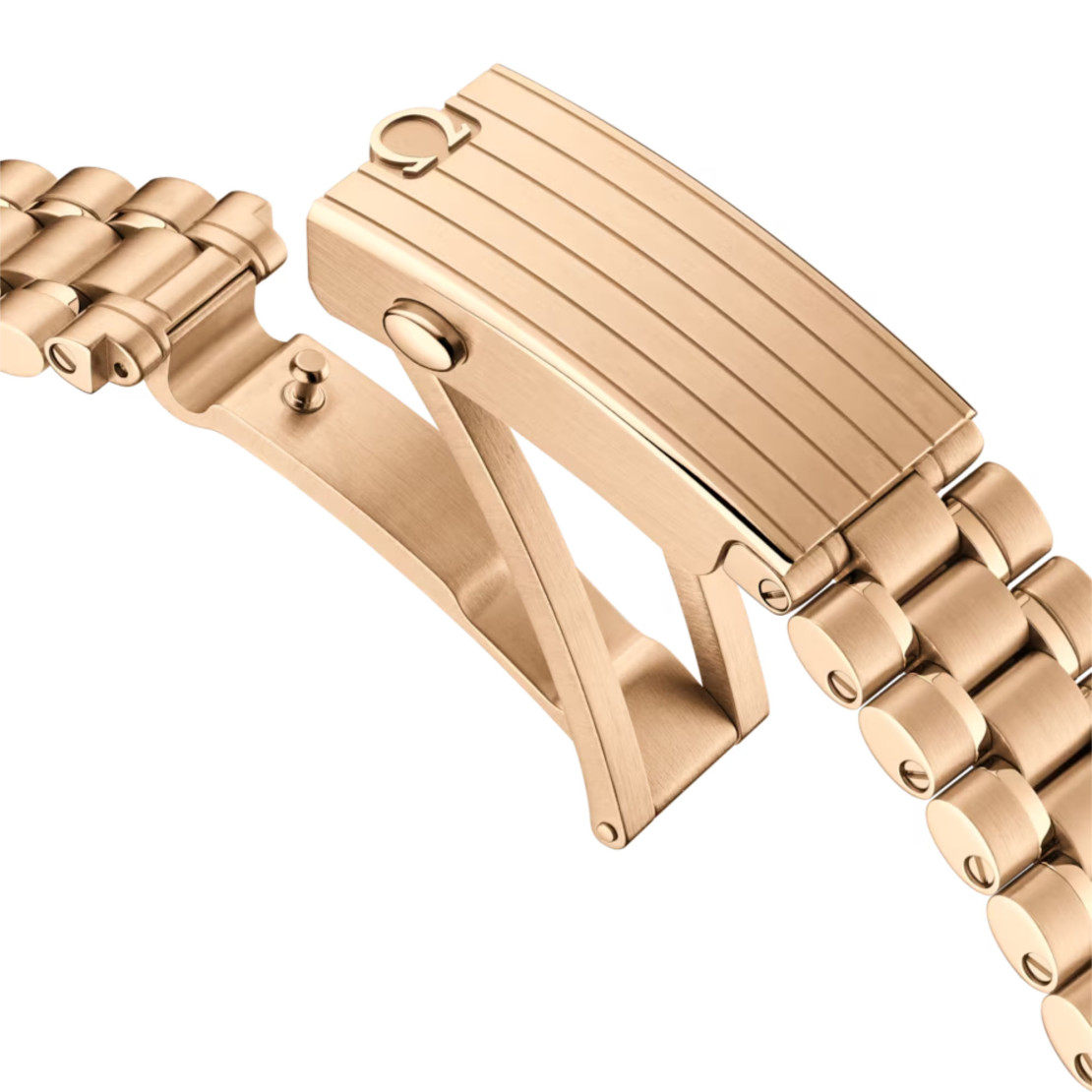 Dieses 42-mm-Modell aus 18 K Moonshine™-Gold verfügt über Saphirglas auf der Vorderseite und dem Gehäuseboden und wird mit einem polierten Armband aus demselben Edelmetall geliefert. Das Design ist inspiriert von der 4. Generation der Speedmaster, die auf dem Mond getragen wurde. Das schwarz lackierte, abgestufte Zifferblatt mit Doppelplatine wird durch weiß lackierte Hilfszifferblätter in rhodinierten Rahmen ergänzt. Zu den Details gehören das OMEGA Logo, Zeiger und Indezes aus 18 K Moonshine™-Gold und der berühmte Punkt über der 90 auf dem schwarzen Keramiklünettenring.