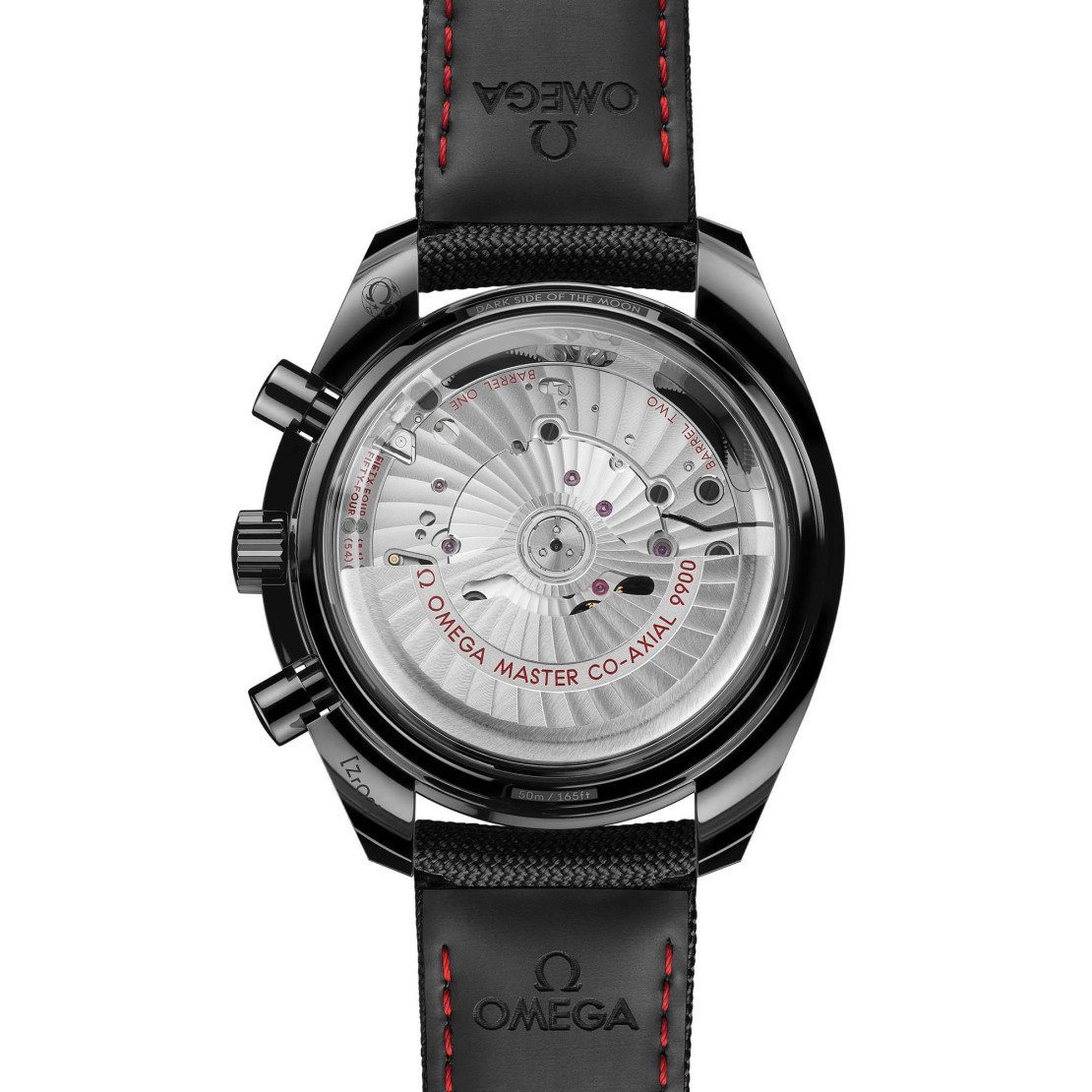 Angetrieben von OMEGAs Co-Axial Master Chronometer Kaliber 9900 mit Automatikaufzug, ist dieser markante Zeitmesser mit einem schwarzen Nylonarmband mit Innenseite aus schwarzem Kautschuk, einer Faltschließe aus Keramik und Federklappen aus keramisiertem Titan ausgestattet.