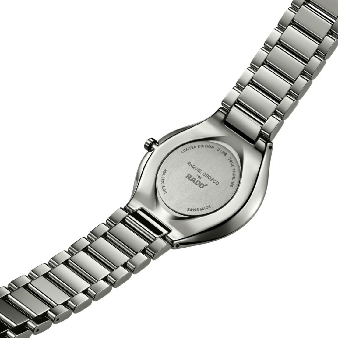 Ref. R27010112 - Die True Thinline x Raquel Orozco ist das Ergebnis einer Zusammenarbeit mit der berühmten mexikanischen Modedesignerin Raquel Orozco. Das ultraflache Gehäuse der auf 99 Exemplare limitierten True Thinline besteht aus einem klassischen Quarzwerk mit 13 Steinen und dem bahnbrechenden Monobloc-Gehäuse (39 mm) – diese Merkmale machen die Uhr sehr elegant und einfach zu tragen.