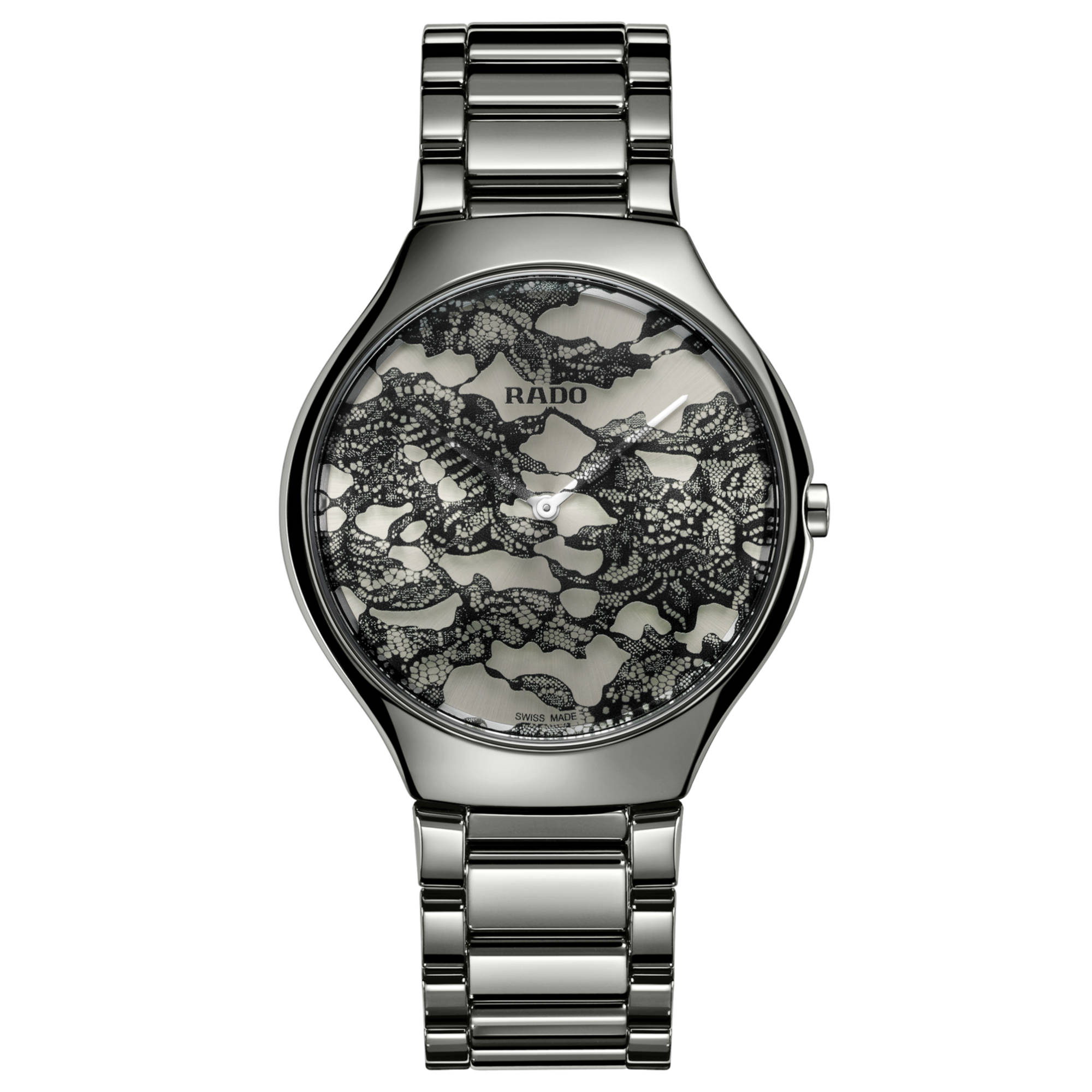 Das schwarze Spitzenmuster wurde per Digitaldruck auf die gewölbte Innenoberfläche des Saphirkristalls aufgetragen. Ein rhodium-plattiertes Zifferblatt und ein grauer Zifferblattring werden von einem Gehäuse aus polierter Plasma-Hightech-Keramik eingerahmt und mit einem dreireihigen Armband aus polierter Plasma-Hightech-Keramik vervollständigt.
