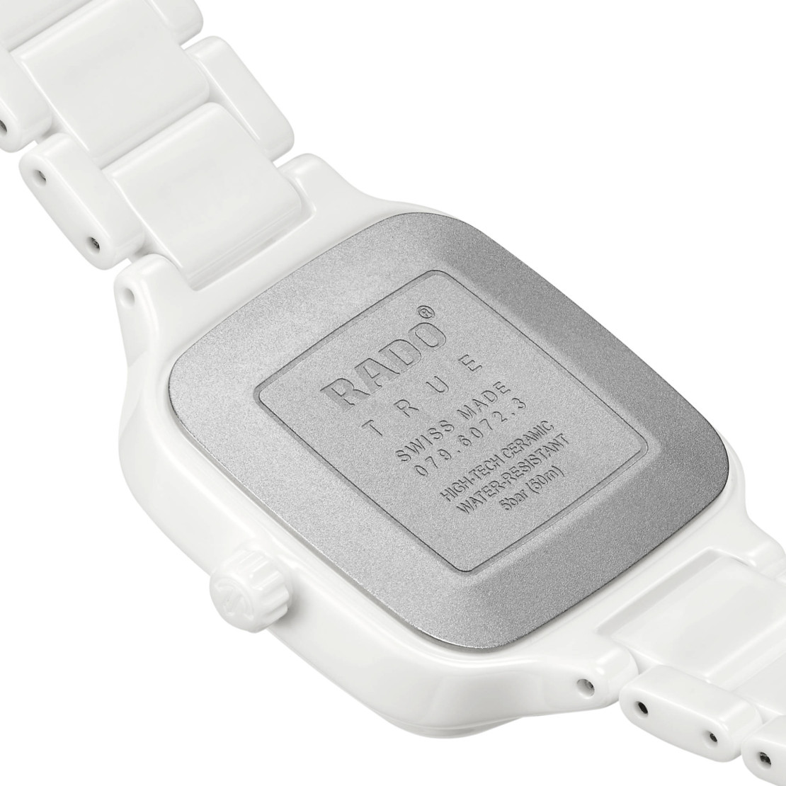 Ref. R27072012 - Gehäuse und Krone der 29 mm grossen True Square sind aus polierter weisser Hightech-Keramik gefertigt. Ausserdem verfügt die Uhr über ein flaches Saphirglas. Dank des Rado Quarzwerks vom Kaliber R079 ist die Uhr ein präziser und zuverlässiger Zeitmesser.