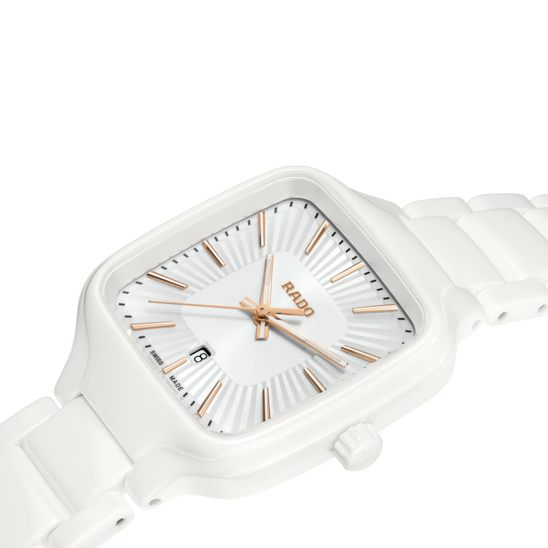 Die roségoldfarbigen Zeiger und Indizes mit weissem Super-LumiNova® sind farblich perfekt auf das Zifferblatt abgestimmt, das über eine geprägte, strahlenförmig plissierte Struktur in Weiss verfügt. Die Uhr ist bis zu einem Druck von 5 bar wasserdicht. Für den angenehmen Tragekomfort der True Square sorgt ein Armband aus polierter weisser Hightech-Keramik mit Dreifach-Faltschliesse aus Titan.