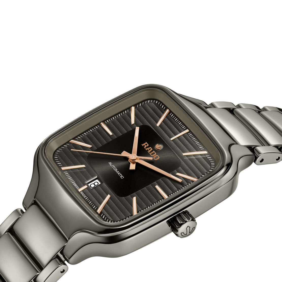 Ref. R27077102 - Gehäuse und Krone der 38 mm grossen True Square sind aus polierter Plasma-Hightech-Keramik gefertigt. Ausserdem verfügt die Uhr über ein flaches Saphirglas. Dank des Rado Automatikwerks R763 ist die Uhr ein präziser und zuverlässiger Zeitmesser. Die roségoldfarbenen Zeiger und Indizes mit weissem Super-LumiNova® sind farblich perfekt auf das Zifferblatt abgestimmt. Dieses verfügt über eine geprägte horizontale Struktur in Grau.