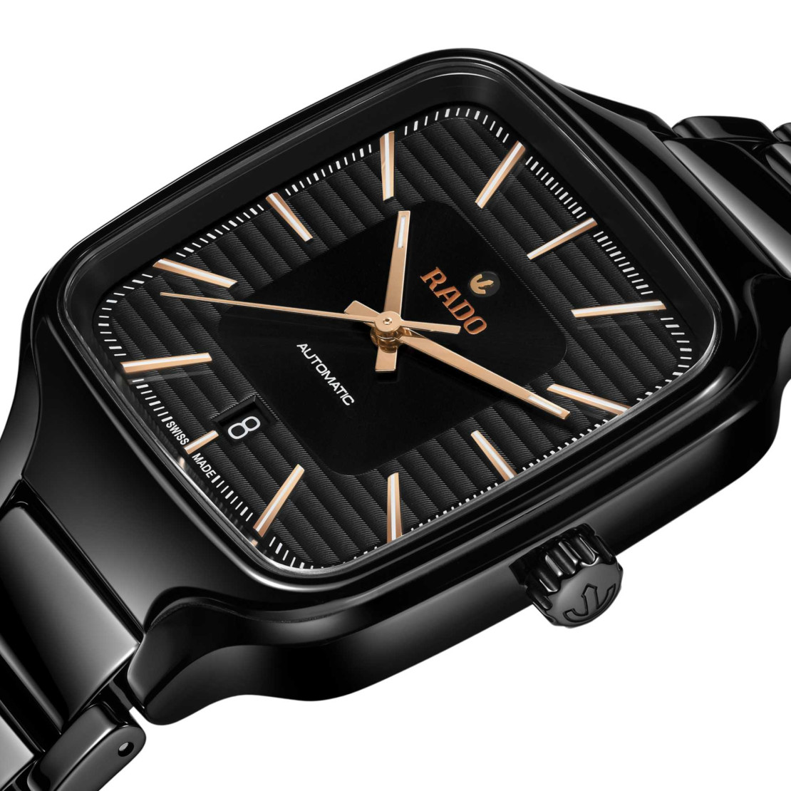 Ref. R27078172 - Gehäuse und Krone der 38 mm grossen True Square sind aus polierter schwarzer Hightech-Keramik gefertigt. Die Uhr verfügt über ein flaches Saphirglas. Das Rado Automatikwerk Kaliber R763 sorgt für eine präzise und zuverlässige Zeitmessung. Die roségoldfarbenen Zeiger und Indizes mit weissem Super-LumiNova® sind farblich perfekt auf das Zifferblatt abgestimmt. Dieses verfügt über eine geprägte horizontale Struktur in Schwarz.