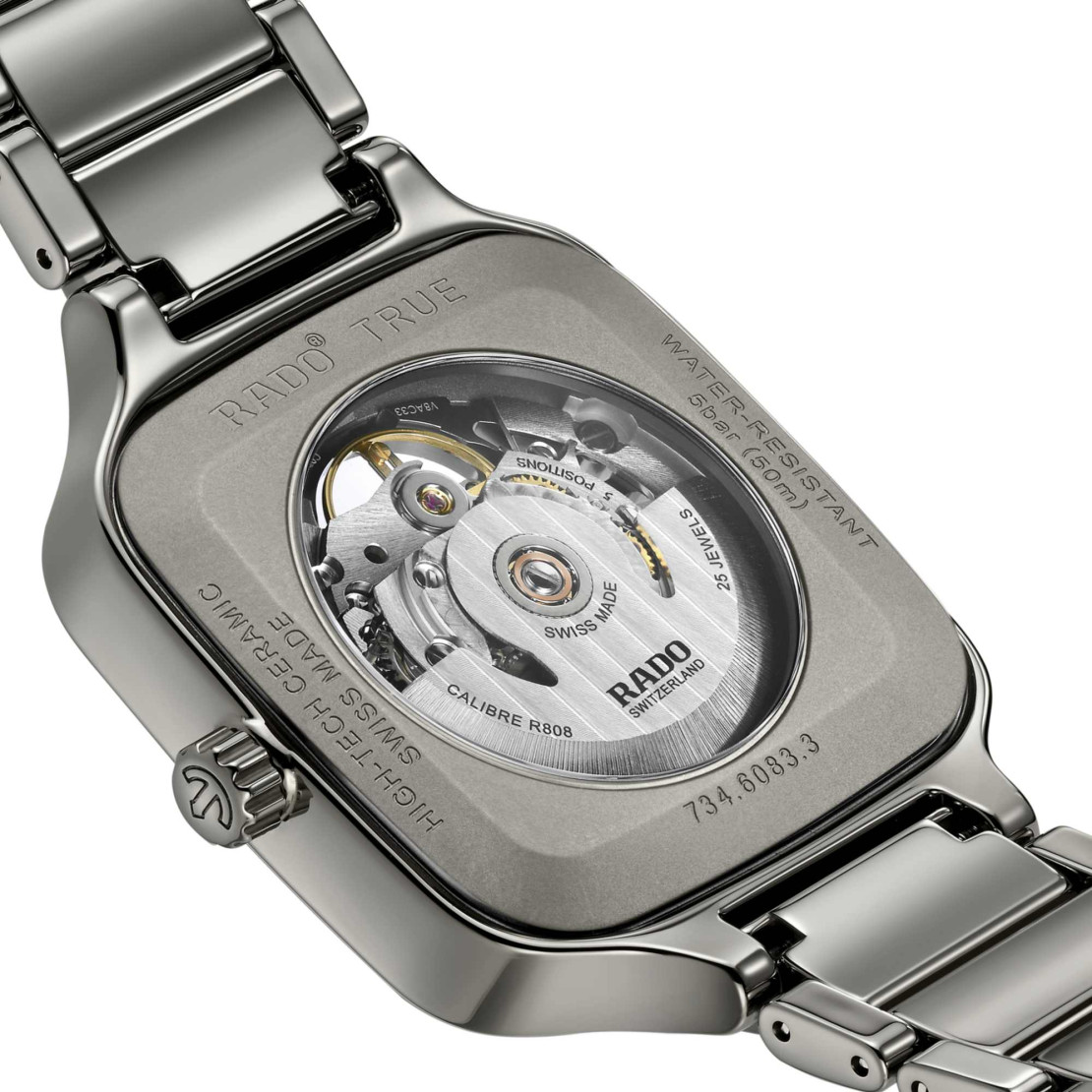 Brücke und obere Platine sind anthrazitfarben beschichtet. Mit ihrem 38 mm grossen Monobloc-Gehäuse und ihrem Armband aus polierter Plasma-Hightech-Keramik bietet die True Square Skeleton typische Rado Merkmale in einer faszinierenden Form.
