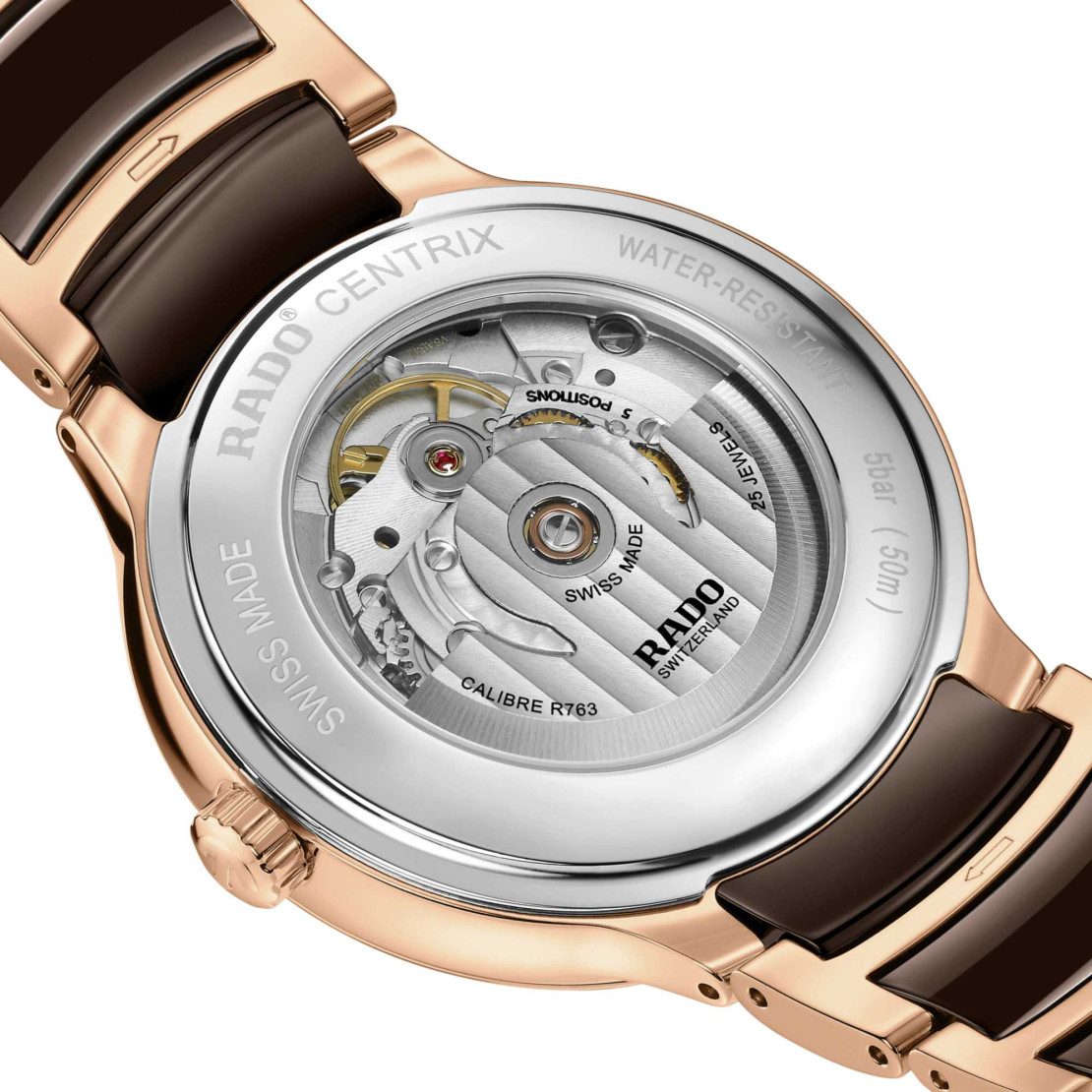 Ref. R30017712 - Die klassische Centrix Automatic Diamonds wurde nicht nur technisch, sondern auch ästhetisch überarbeitet. Beim neuen Modell reicht das abgerundete Saphirglas bis hin zum Rand. Außerdem geht das gewölbte Gehäuse nahtlos in den geschwungenen Kristallrand über. Die Gesamtoptik dieses ikonischen Zeitmessers wird durch überarbeitete Bandanstöße am Gehäuse und ein Armband aus poliertem roségoldfarbenen Edelstahl mit PVD-Beschichtung und Mittelgliedern aus brauner Hightech-Keramik abgerundet.