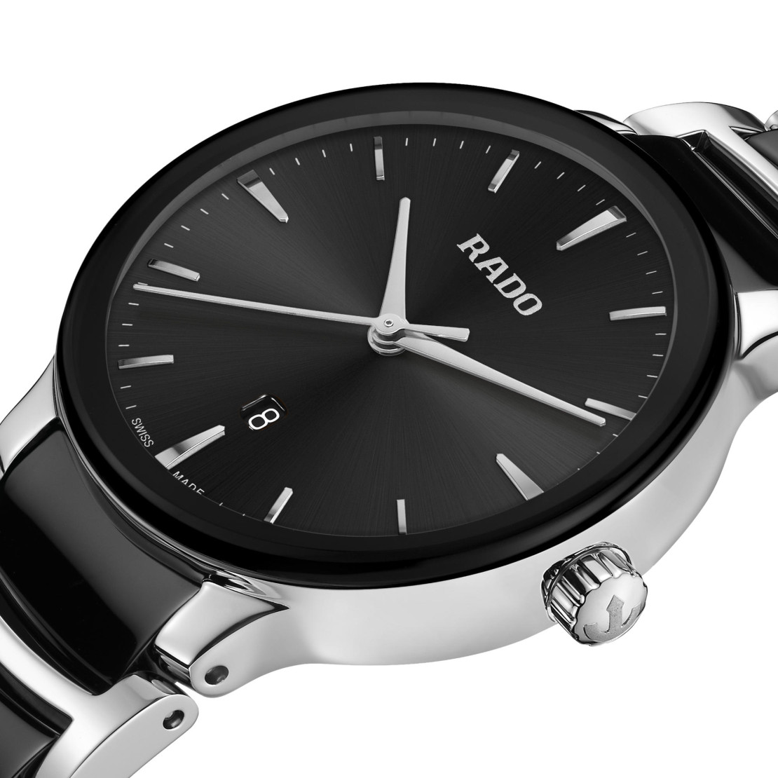 Ref. R30026152 - Die klassische Centrix Quartz wurde nicht nur technisch, sondern auch ästhetisch überarbeitet. Beim neuen Modell reicht das gewölbte Saphirglas bis hin zum Rand und scheint nahtlos in das sanft gerundete Gehäuse überzugehen. Die perfekt angepassten Bandanstösse verbinden das Gehäuse mit dem Armband aus poliertem Edelstahl und Mittelgliedern aus schwarzer Hightech-Keramik. Sie verleihen dem ikonischen Zeitmesser seine vollkommene Erscheinung.