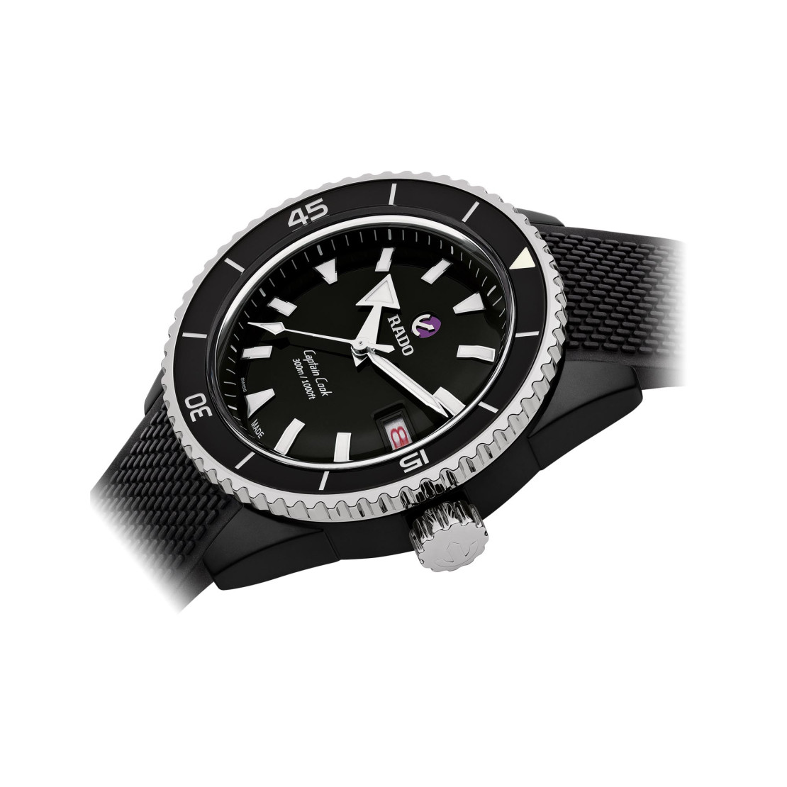 Ref. R32129158 - Die Captain Cook High-Tech Ceramic Diver ist bis zu einer Tiefe von 300 m wasserdicht. Zeiger und Indizes der nach der ISO-Norm 6425 zertifizierten Taucheruhr sind mit SuperLuminova® beschichtet und damit auf dem schwarz lackierten und polierten Zifferblatt ausgezeichnet sichtbar. Das 43 mm große Monobloc-Gehäuse ist aus mattschwarzer Hightech-Keramik gefertigt, während die drehbare Lünette aus gehärtetem polierten Edelstahl gemacht ist. Im Inneren ist der Zeitmesser mit einem Rado R763 Automatikwerk ausgestattet, das die Voraussetzungen des Standard-Genauigkeitstests um volle fünf Punkte übertrifft und eine Gangreserve von 80 Stunden bietet. Geliefert wird dieses Modell mit einem Armband aus mattschwarzem Kautschuk. Ganz egal, in welchem Bereich Sie Ihren Pioniergeist zum Einsatz bringen, die Captain Cook High-Tech Ceramic Diver wird Ihnen dabei über Jahre hinweg zuverlässig und solide zur Seite stehen.Das Wichtigste