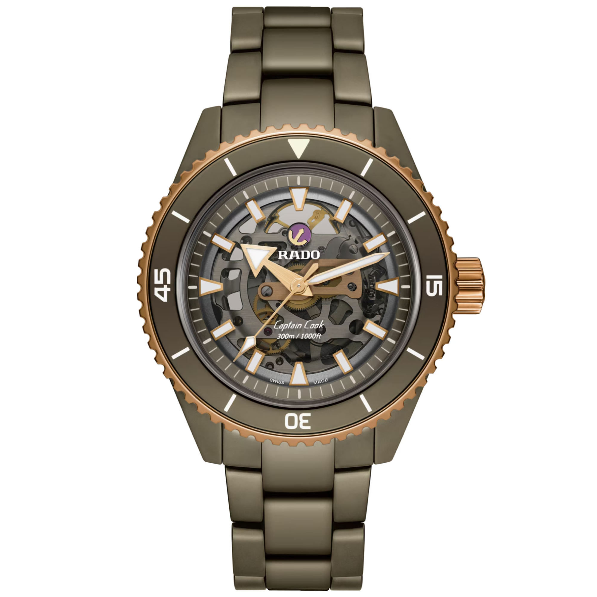Ref. R32150162 - Die Captain Cook High-Tech Ceramic Skeleton stellt ihr innovatives R808 Uhrwerk zur Schau – ein Wunderwerk aus Kontrasten, Know-how und intelligenter Geometrie, das einen klaren Blick auf die verschiedenen Bauteile gewährt. Die Uhr ist mit einer antimagnetischen und höchst zuverlässigen Nivachron™ Spiralfeder ausgestattet, die in fünf Lagen getestet wurde und eine Gangreserve von bis zu 80 Stunden bietet. Ihr edles Monobloc-Gehäuse aus Hightech-Keramik in Olivgrün wird durch eine roségoldfarbene drehbare Lünette mit einem olivgrünen Keramikeinsatz abgerundet – farblich perfekt und optisch absolut harmonisch auf Gehäuse und Bandanstösse abgestimmt. Das Zifferblatt ist klar und minimalistisch gestaltet und verfügt über markante geometrische Indizes und Zeiger in Roségoldtönen, die dank Beschichtung mit weissem Super-LumiNova® auch bei schlechten Lichtverhältnissen bestens abgelesen werden können. Dank ihres farblich abgestimmten, dreireihigen Armbands aus olivgrüner Hightech-Keramik mit Dreifachschliesse aus Titan ist die neue Captain Cook auch dann ein treuer Begleiter, wenn Sie sich bei Ihren Entdeckungstouren einmal in ein etwas schrofferes und anspruchsvolleres Terrain vorwagen.