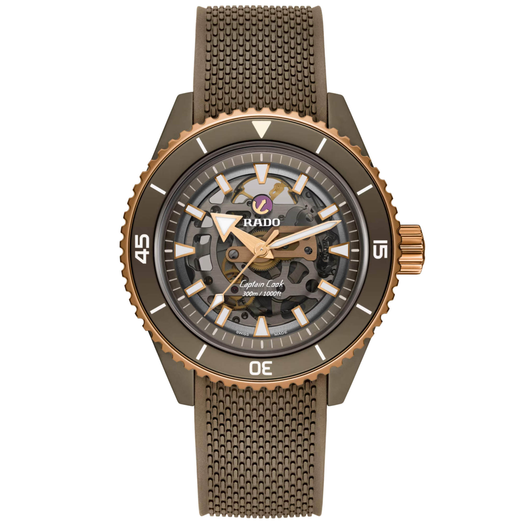 Ref. R32150168 - Die Captain Cook High-Tech Ceramic Skeleton stellt ihr innovatives R808 Uhrwerk zur Schau – ein Wunderwerk aus Kontrasten, Know-how und intelligenter Geometrie, das einen klaren Blick auf die verschiedenen Bauteile gewährt. Die Uhr ist mit einer antimagnetischen und höchst zuverlässigen NivachronTM Spiralfeder ausgestattet, die in fünf Lagen getestet wurde und eine Gangreserve von bis zu 80 Stunden bietet. Ihr edles Monobloc-Gehäuse aus Hightech-Keramik in Olivgrün wird durch eine roségoldfarbene drehbare Lünette mit einem olivgrünen Keramikeinsatz abgerundet – farblich perfekt und optisch absolut harmonisch auf Gehäuse und Bandanstöße abgestimmt. Das Zifferblatt ist klar und minimalistisch gestaltet und verfügt über markante geometrische Indizes und Zeiger in Roségoldtönen, die dank Beschichtung mit weissem Super-LumiNova® auch bei schlechten Lichtverhältnissen bestens abgelesen werden können. Mit ihrem farblich abgestimmten Armband aus olivgrünem Kautschuk und ihrer Schliessenabdeckung aus Hightech-Keramik zeigt die neue Captain Cook ihre sportliche Seite.