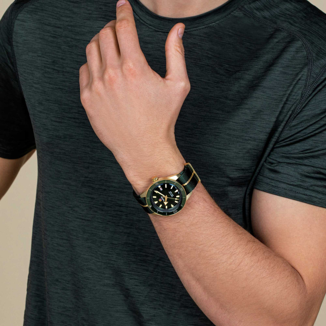 Ref. R32504317 - Das Design aus dem Jahr 1962 wird in einer neuen und verbesserten Form für das 21. Jahrhundert wieder zum Leben erweckt. Vintage-Details, eine originalgetreue Gestaltung und zeitgemäße Funktionen für den modernen Träger machen die Captain Cook zu einer Uhr, die garantiert die Zeit überdauert. Das Modell mit einem Gehäuse aus Bronze sowie einem Nato Band aus widerstandsfähigen Synthetikgewebe, ist die perfekte Kombination aus antiken und modernen Materialien.