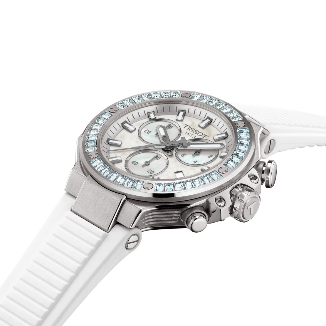 Das Gehäuse dieser sportlichen Uhr besteht aus 316L-Edelstahl. Kratzfestes, entspiegeltes Saphirglas über dem echten Perlmuttzifferblatt garantiert erhöhte Robustheit. Die Lünette ist mit per Baguetteschliff veredelten Keramikelementen besetzt. Ein flexibles, weißes Silikonarmband mit Dornschließe hält den markanten Zeitmesser komfortabel und sicher am Handgelenk.