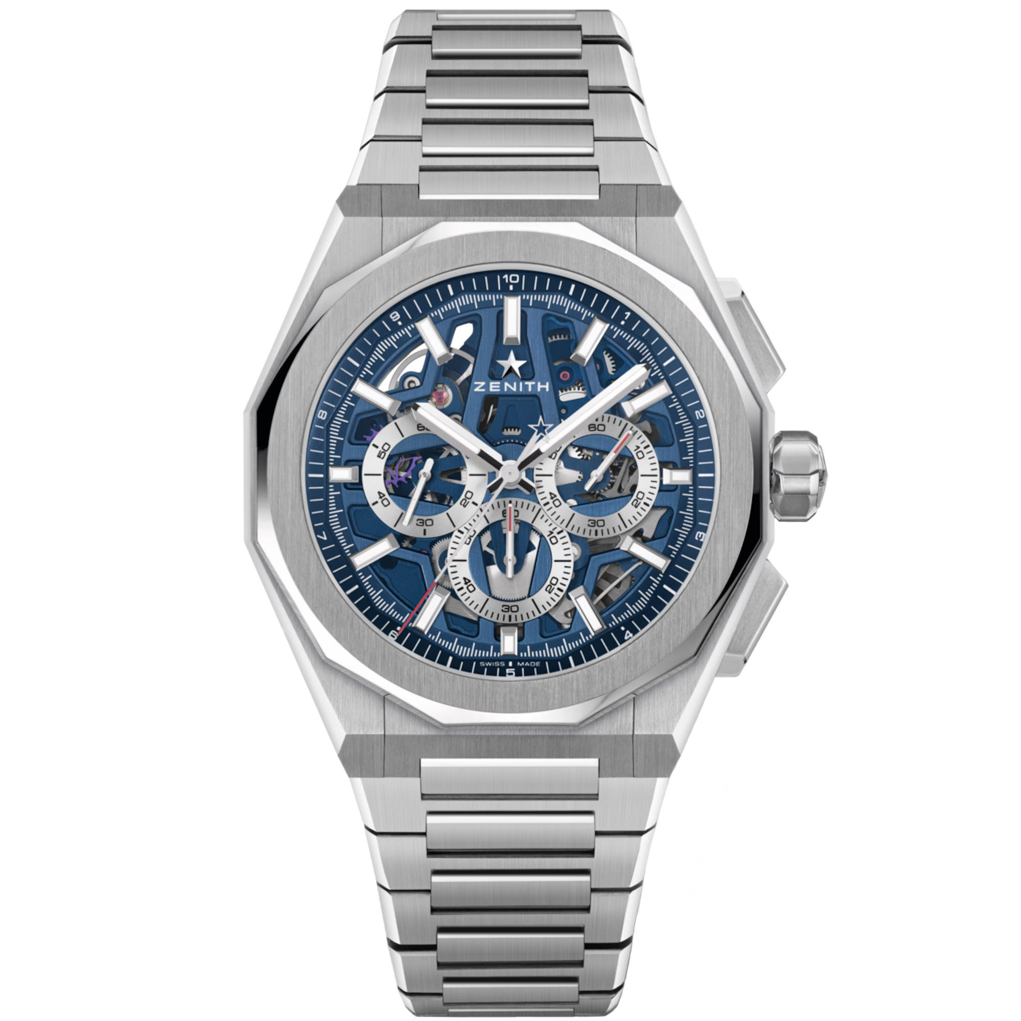 Ref. 03.9500.3600/79.I001 - Die DEFY Skyline Chronograph Skeleton im achteckigen 42-mm-Edelstahlgehäuse mit facettierter Lünette und einem blauen offenen Zifferblatt mit kontrastierenden silberfarbenen Zählern. Angetrieben von dem skelettierten Manufakturwerk El Primero 3600SK, einem automatischen Hochfrequenzchronographen mit der ersten 1/10-Sekunden-Anzeige.