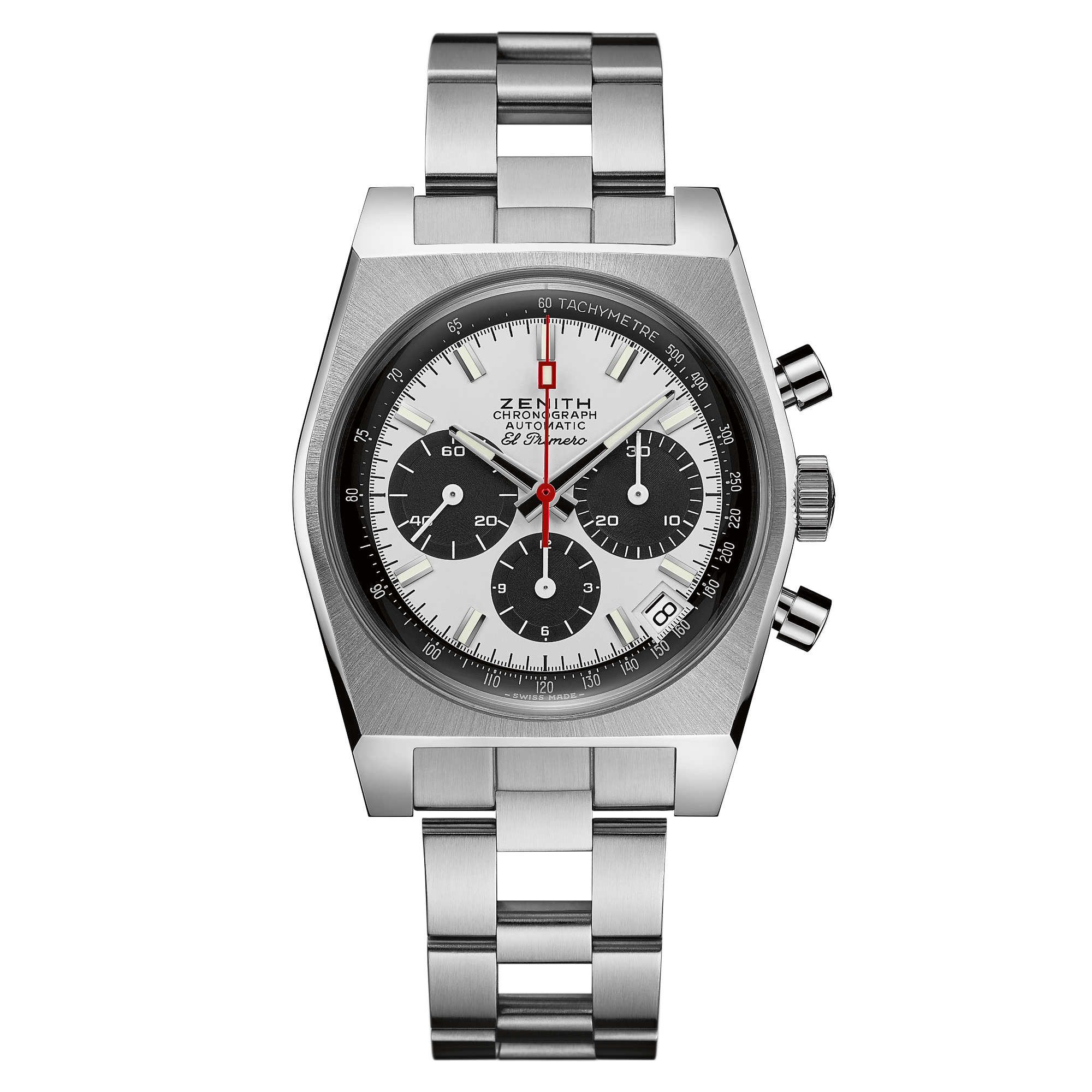 Ref. 03.A384.400/21.M384 - Die CHRONOMASTER El Primero A384 Revival ist eine originalgetreue Reproduktion der allerersten ZENITH Uhr in Edelstahl mit dem automatischen Hochfrequenzchronographenkaliber El Primero von 1969. Das „Tonneau“-Gehäuse und das „Panda“-Zifferblatt wurden mithilfe der Originalproduktionspläne perfekt nachgebildet. Gepaart mit einem dazu passenden „Leiter“-Armband aus Edelstahl.