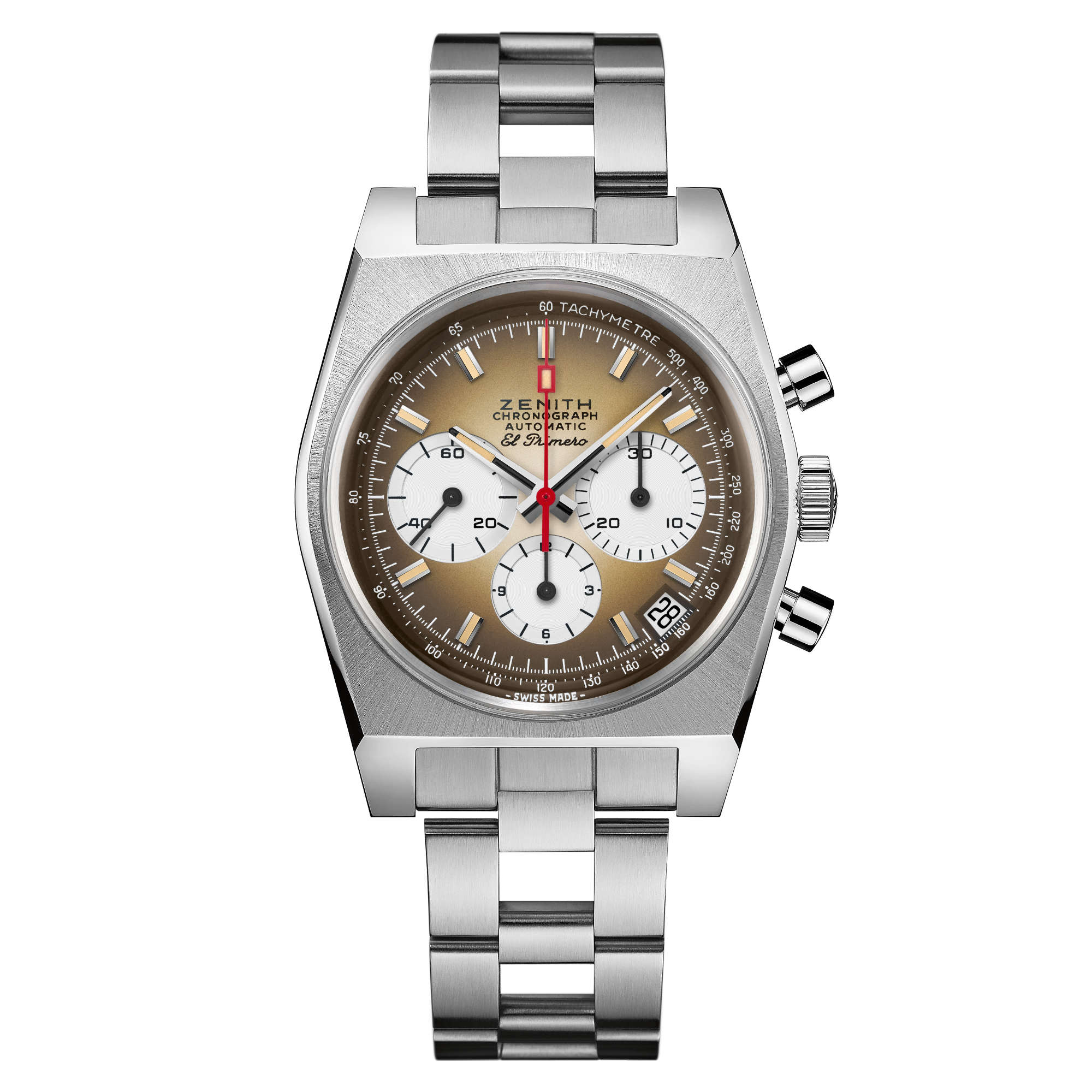 Ref. 03.A384.400/385.M385 - Eine moderne, äußerst originalgetreue Neuauflage der A385 von 1969, einer der ersten Edelstahluhren mit dem automatischen Chronographenkaliber El Primero. Das 37 mm große „Tonneau“-Gehäuse umschließt ein abgestuftes Zifferblatt in warmen Tönen, die nach außen dunkler werden. Gepaart mit einem dazu passenden „Leiter“-Armband aus Edelstahl.