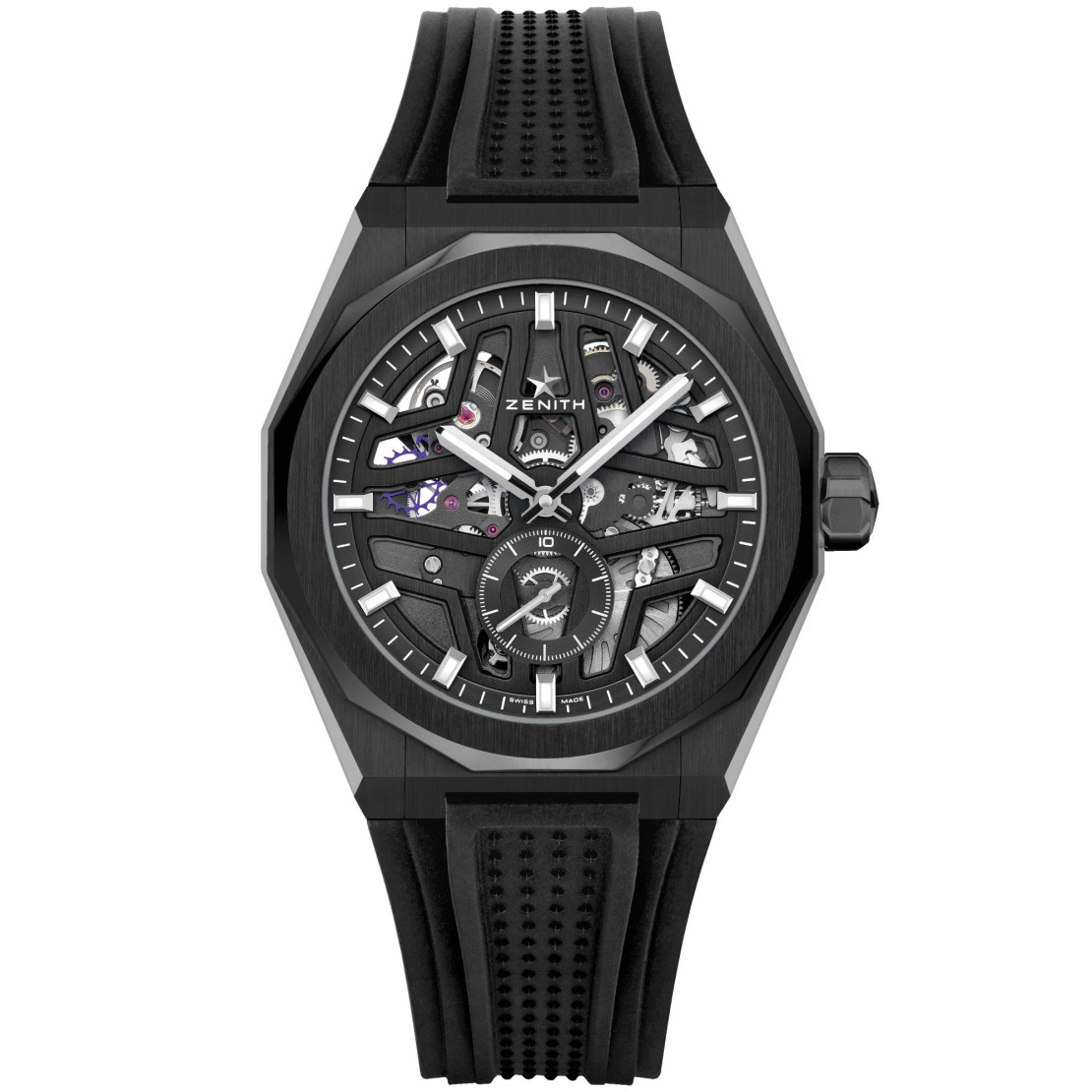 Ref. 49.9300.3620/78.I001 - Die DEFY Skyline Skeleton im achteckigen 41-mm-Gehäuse aus schwarzer Keramik mit facettierter Lünette und einem schwarzen offenen Zifferblatt, das den emblematischen vierzackigen Stern von ZENITH aufgreift. Angetrieben von dem skelettierten automatischen Hochfrequenzmanufakturwerk El Primero 3620 SK mit der ersten 1/10-Sekundenanzeige. Im Lieferumfang enthalten sind ein Keramikarmband und ein Kautschukarmband mit schwarzem Muster, um das Auswechselsystem in vollem Umfang nutzen zu können.
