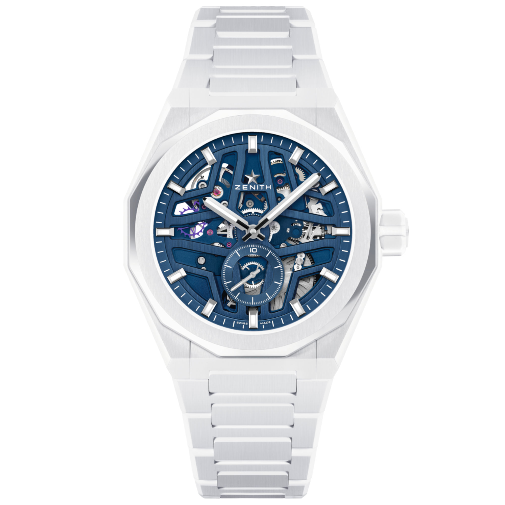 Ref. 49.9301.3620/79.I001 - Die DEFY Skyline Skeleton im achteckigen 41-mm-Gehäuse aus weißer Keramik mit facettierter Lünette und einem blauen offenen Zifferblatt, das den emblematischen vierzackigen Stern von ZENITH aufgreift. Angetrieben von dem skelettierten automatischen Hochfrequenzmanufakturwerk El Primero 3620 SK mit der ersten 1/10-Sekundenanzeige. Austauschbares Armband aus Keramik mit einem weiß gemustertem Kautschukarmband. Es wird ein zweites Armband angeboten, um das Auswechselsystem der Uhr in vollem Umfang nutzen zu können.