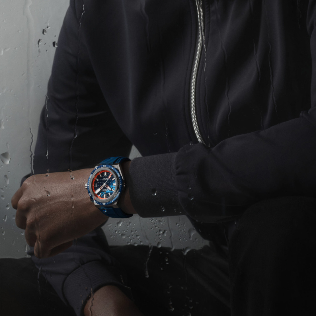 Ref. 95.9601.3620/51.I301 - Die DEFY Extreme Diver mit ihrem kantigen 42,5-mm-Gehäuse aus Titan verfügt über eine drehbare blaue Keramiklünette und ein Heliumventil und bietet eine Wasserdichtigkeit bis 60 ATM (600 Meter). Ausgestattet mit einem blauen Zifferblatt mit Sternenmuster sowie Leuchtindizes und -zeigern. Angetrieben vom automatischen El Primero 3620 SC Uhrwerk mit 60 Stunden Gangreserve. Armbandwechselsystem mit Titanarmband, Kautschukarmband und einteiligem Stoffarmband aus recycelten Fischernetzen.